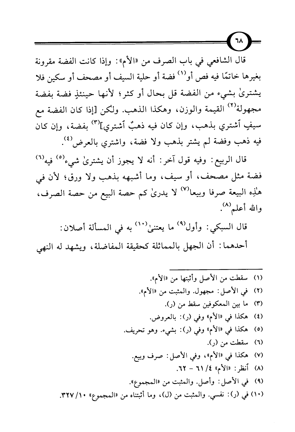 قال الربيع: وفيه قول آخر: أنه لا يجوز أن يشترى شيء (¬5) فيه (¬6) فضة مثل مصحف، أو سيف، وما أشبهه بذهب ولا ورق؛ لأن في هذِه البيعة صرفا وبيعا (¬7) لا يدرى كم حصة البيع من حصة الصرف، والله أعلم (¬8).