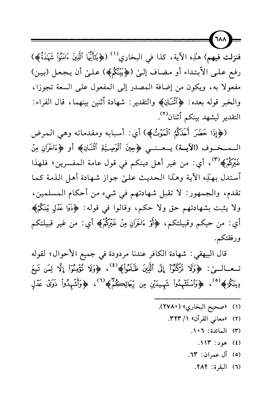 ({إِذَا حَضَرَ أَحَدَكُمُ الْمَوْتُ}) أي: أسبابه ومقدماته وهي المرض المخوف (الآية) يعني {حِينَ الْوَصِيَّةِ اثْنَانِ} أو {أَوْ آخَرَانِ مِنْ غَيْرِكُمْ} (¬3)، أي: من غير أهل دينكم في قول عامة المفسرين؛ فلهذا استدل بهذِه الآية وهذا الحديث على جواز شهادة أهل الذمة كما تقدم، والجمهور: لا تقبل شهادتهم في شيء من أحكام المسلمين، ولا يثبت بشهادتهم حق ولا حكم، وقالوا في قوله: {ذَوَا عَدْلٍ مِنْكُمْ} أي: من حيكم وقبيلتكم، {أَوْ آخَرَانِ مِنْ غَيْرِكُمْ} وأي: من غير قبيلتكم ورفقتكم.