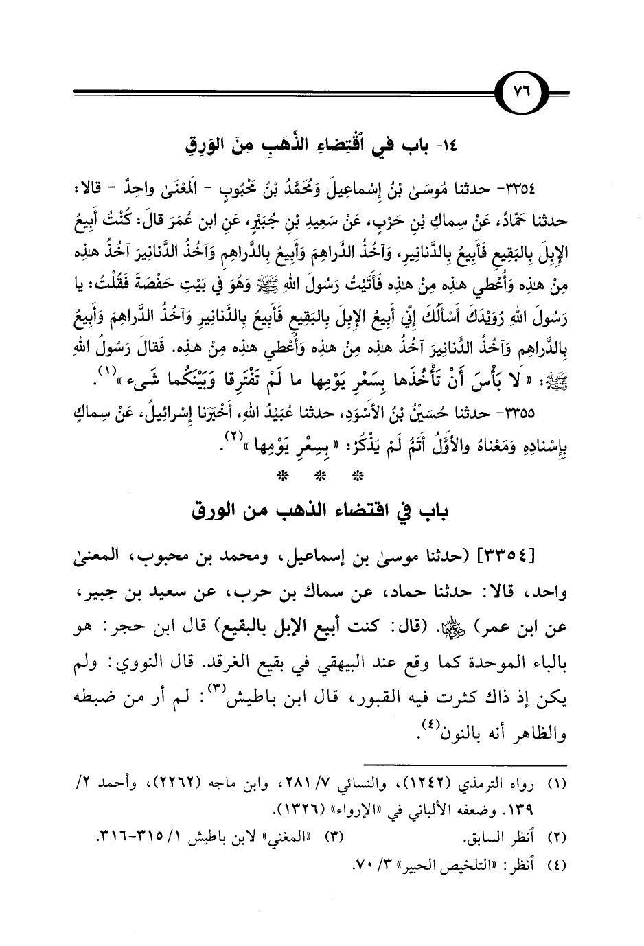 [3354] (حدثنا موسى بن إسماعيل، ومحمد بن محبوب، المعنى واحد، قالا: حدثنا حماد، عن سماك بن حرب، عن سعيد بن جبير، عن ابن عمر) -رضي الله عنهما -. (قال: كنت أبيع الإبل بالبقيع) قال ابن حجر: هو بالباء الموحدة كما وقع عند البيهقي في بقيع الغرقد. قال النووي: ولم يكن إذ ذاك كثرت فيه القبور، قال ابن باطيش (¬3): لم أر من ضبطه والظاهر أنه بالنون (¬4).