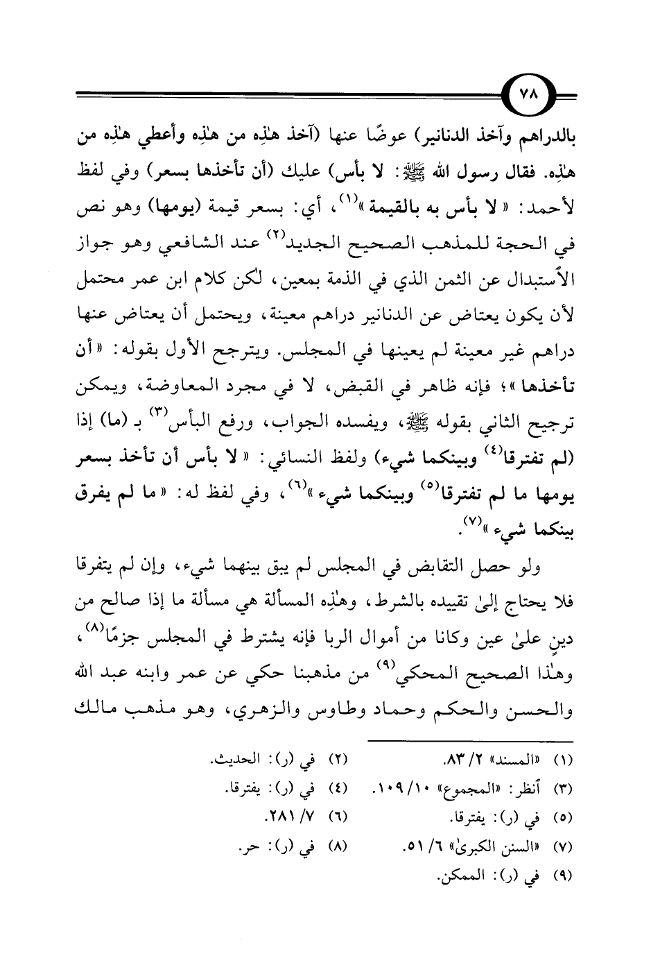 ولو حصل التقابض في المجلس لم يبق بينهما شيء، وإن لم يتفرقا فلا يحتاج إلى تقييده بالشرط، وهذِه المسألة هي مسألة ما إذا صالح من دينٍ على عين وكانا من أموال الربا فإنه يشترط في المجلس جزمًا (¬8)، وهذا الصحيح المحكي (¬9) من مذهبنا حكي عن عمر وابنه عبد الله والحسن والحكم وحماد وطاوس والزهري، وهو مذهب مالك