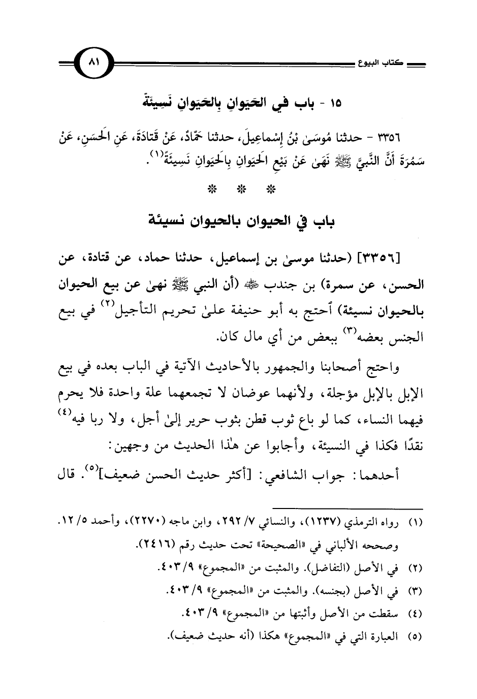 3356 - حدثنا مُوسَى بْنُ إِسْماعِيلَ، حدثنا حَمّادٌ، عَنْ قَتادَةَ، عَنِ الحَسَنِ، عَنْ سَمُرَةَ أَنَّ النَّبيَّ - صلى الله عليه وسلم - نَهَى عَنْ بَيْعِ الَحيَوانِ بِالَحيَوانِ نَسِيئَةً (¬1).