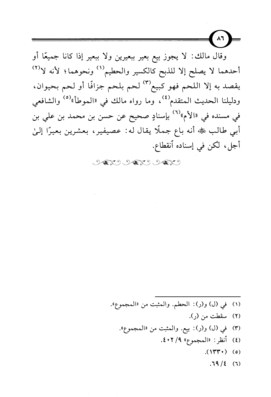 وقال مالك: لا يجوز بيع بعير ببعيرين ولا ببعير إذا كانا جميعًا أو أحدهما لا يصلح إلا للذبح كالكسير والحطيم (¬1) ونحوهما؛ لأنه لا (¬2) يقصد به إلا اللحم فهو كبيع (¬3) لحم بلحم جزافًا أو لحم بحيوان، ودليلنا الحديث المتقدم (¬4)، وما رواه مالك في "الموطأ" (¬5) والشافعي في مسنده في "الأم" (¬6) بإسنادٍ صحيح عن حسن بن محمد بن علي بن أبي طالب -رضي الله عنه- أنه باع جملًا يقال له: عصيفير، بعشرين بعيرًا إلى أجل، لكن في إسناده انقطاع.