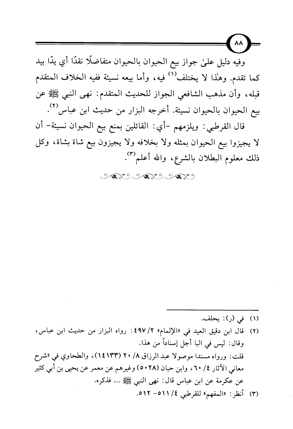 قال القرطبي: ويلزمهم -أي: القائلين بمنع بيع الحيوان نسيئة- أن لا يجيزوا بيع الحيوان بمثله ولا بخلافه ولا يجيزون بيع شاة بشاة، وكل ذلك معلوم البطلان بالشرع، والله أعلم (¬3).