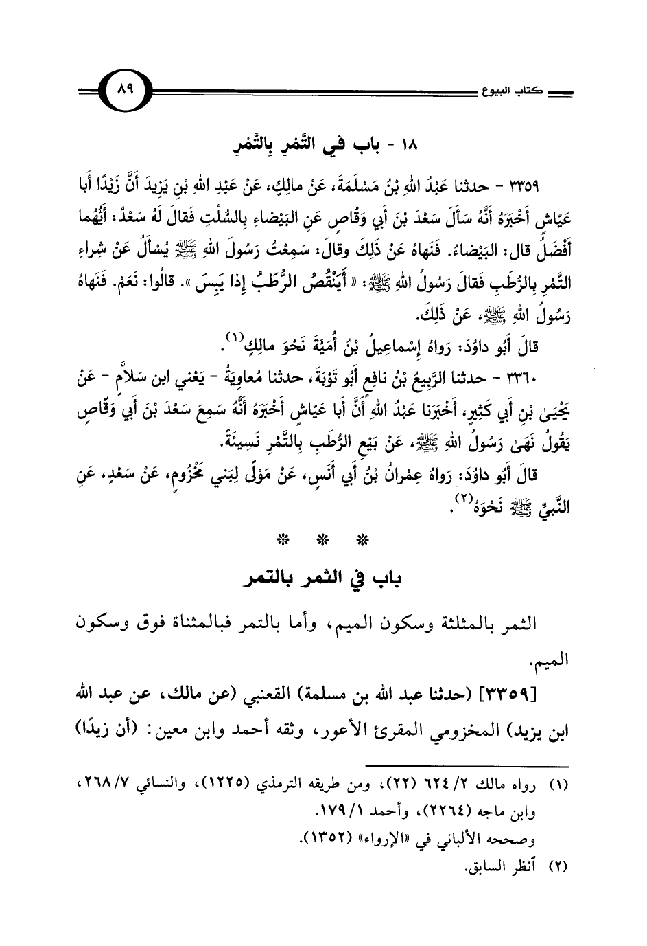 3359 - حدثنا عَبْدُ اللهِ بْن مَسْلَمَةَ، عَنْ مالِكٍ، عَنْ عَبْدِ اللهِ بْنِ يَزِيدَ أَنَّ زَيْدًا أَبا عَيّاشٍ أَخْبَرَهُ أنَّهُ سَأَلَ سَعْدَ بْنَ أَبي وَقّاصٍ عَنِ البَيْضاءِ بِالسُّلْتِ فَقالَ لَهُ سَعْدٌ: أَيُّهُما أَفْضَل قال: البَيْضاءُ. فَنَهاهُ عَنْ ذَلِكَ وقالَ: سَمِعْتُ رَسُولَ اللهِ - صلى الله عليه وسلم - يسْأَل عَنْ شِراءِ التَّمْرِ بِالرّطَبِ فَقالَ رَسُولُ اللهِ - صلى الله عليه وسلم -: "أَيَنْقُصُ الرُّطَبُ إِذا يَبِسَ". قالُوا: نَعَمْ. فَنَهاهُ رَسُول اللهِ - صلى الله عليه وسلم -، عَنْ ذَلِكَ.