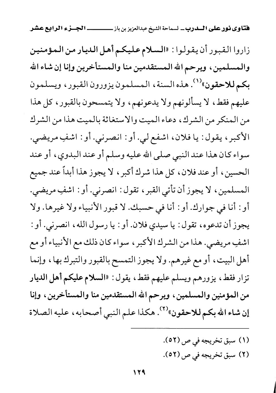 زاروا القبور أن يقولوا: «السلام عليكم أهل الديار من المؤمنين والمسلمين، ويرحم الله المستقدمين منا والمستأخرين وإنا إن شاء الله بكم للاحقون (¬1)» هذه السنة، المسلمون يزورون القبور، ويسلمون عليهم فقط، لا يسألونهم ولا يدعونهم، ولا يتمسحون بالقبور، كل هذا من المنكر من الشرك، دعاء الميت والاستغاثة بالميت هذا من الشرك الأكبر، يقول: يا فلان اشفع لي. أو: انصرني. أو: اشف مريضي. سواء كان هذا عند النبي صلى الله عليه وسلم أو عند البدوي، أو عند الحسين، أو عند فلان، كل هذا شرك أكبر، لا يجوز هذا أبدا عند جميع المسلمين، لا يجوز أن تأتي القبر، تقول: انصرني. أو: اشف مريضي. أو: أنا في جوارك. أو: أنا في حسبك. لا قبور الأنبياء ولا غيرها. ولا يجوز أن تدعوه، تقول: يا سيدي فلان. أو: يا رسول الله، انصرني. أو: اشف مريضي. هذا من الشرك الأكبر، سواء كان ذلك مع الأنبياء أو مع أهل البيت، أو مع غيرهم ولا يجوز التمسح بالقبور والتبرك بها، وإنما تزار فقط، يزورهم ويسلم عليهم فقط، يقول: «السلام عليكم أهل الديار من المؤمنين والمسلمين، ويرحم الله المستقدمين منا والمستأخرين، وإنا إن شاء الله بكم للاحقون (¬2)» هكذا علم النبي أصحابه عليه الصلاة