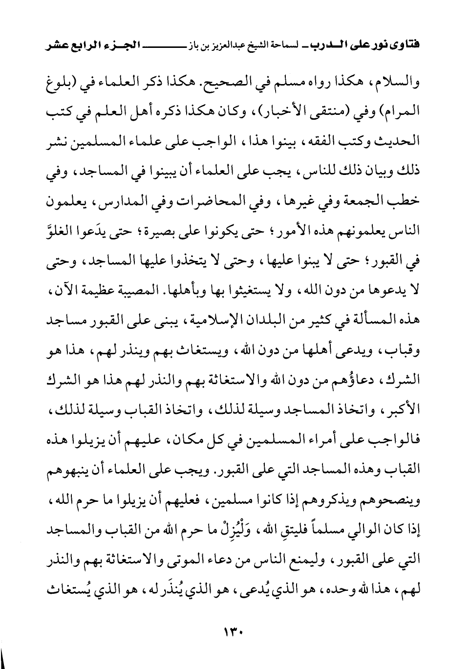 والسلام، هكذا رواه مسلم في الصحيح، هكذا ذكر العلماء في (بلوغ المرام) وفي (منتقى الأخبار) وكان هكذا ذكره أهل العلم في كتب الحديث وكتب الفقه، بينوا هذا، الواجب على علماء المسلمين نشر ذلك وبيان ذلك للناس، يجب على العلماء أن يبينوا في المساجد، وفي خطب الجمعة وفي غيرها، وفي المحاضرات وفي المدارس يعلمون الناس يعلمونهم هذه الأمور، حتى يكونوا على بصيرة، حتى يدعوا الغلو في القبور حتى لا يبنوا عليها، وحتى لا يتخذوا عليها المساجد، وحتى لا يدعوها من دون الله، ولا يستغيثوا بها وبأهلها. المصيبة عظيمة الآن، هذه المسألة في كثير من البلدان الإسلامية، يبنى على القبور مساجد وقباب، ويدعى أهلها من دون الله، ويستغاث بهم وينذر لهم، هذا هو الشرك، دعاؤهم من دون الله والاستغاثة بهم والنذر لهم هذا هو الشرك الأكبر، واتخاذ المساجد وسيلة لذلك، واتخاذ القباب وسيلة لذلك، فالواجب على أمراء المسلمين في كل مكان، عليهم أن يزيلوا هذه القباب وهذه المساجد التي على القبور، ويجب على العلماء أن ينبهوهم وينصحوهم ويذكروهم إذا كانوا مسلمين، فعليهم أن يزيلوا ما حرم الله، إذا كان الوالي مسلما فليتق الله، وليزل ما حرم الله من القباب والمساجد التي على القبور، وليمنع الناس من دعاء الموتى والاستغاثة بهم والنذر لهم، هذا لله وحده، هو الذي يدعى، هو الذي ينذر له، هو الذي يستغاث