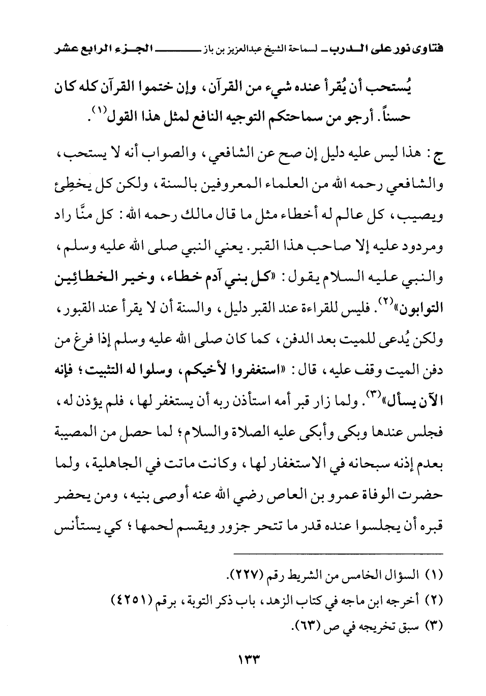 ج: هذا ليس عليه دليل إن صح عن الشافعي، والصواب أنه لا يستحب، والشافعي رحمه الله من العلماء المعروفين بالسنة، ولكن كل يخطئ ويصيب، كل عالم له أخطاء مثل ما قال مالك رحمه الله: كل منا راد ومردود عليه إلا صاحب هذا القبر، يعني النبي صلى الله عليه وسلم، والنبي عليه السلام يقول: «كل بني آدم خطاء، وخير الخطائين التوابون (¬2)» فليس للقراءة عند القبر دليل، والسنة أن لا يقرأ عند القبور، ولكن يدعى للميت بعد الدفن، كما كان صلى الله عليه وسلم إذا فرغ من دفن الميت وقف عليه، قال: «استغفروا لأخيكم، وسلوا له التثبيت، فإنه الآن يسأل (¬3)» ولما زار قبر أمه استأذن ربه أن يستغفر لها، فلم يؤذن له، فجلس عندها وبكى وأبكى عليه الصلاة والسلام، لما حصل من المصيبة بعدم إذنه سبحانه في الاستغفار لها، وكانت ماتت في الجاهلية، ولما حضرت الوفاة عمرو بن العاص رضي الله عنه أوصى بنيه، ومن يحضر قبره أن يجلسوا عنده قدر ما تنحر جزور ويقسم لحمها، كي يستأنس