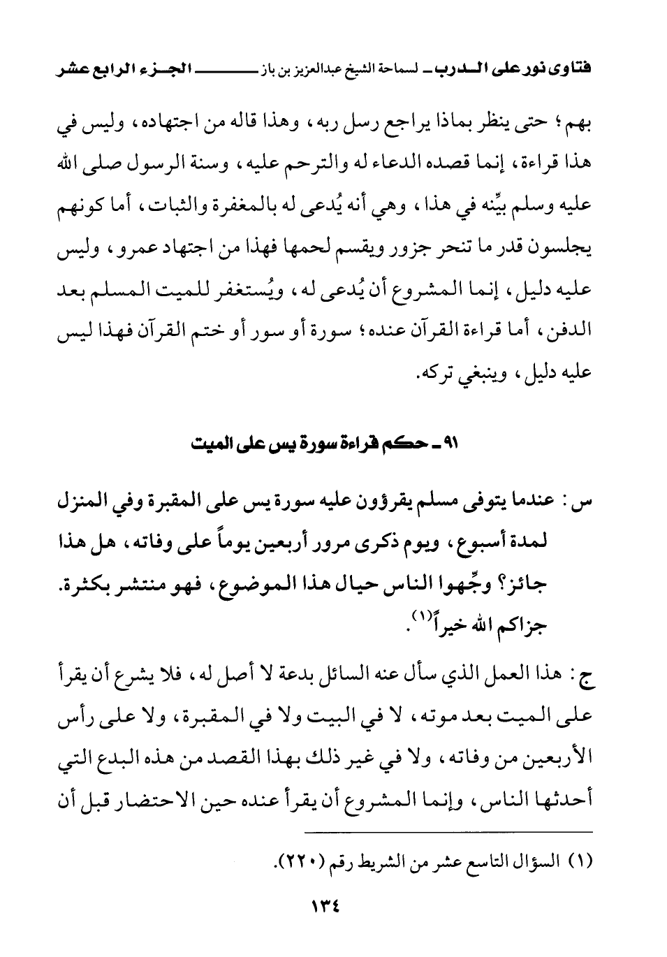 س: عندما يتوفى مسلم يقرؤون عليه سورة يس على المقبرة وفي المنزل لمدة أسبوع، ويوم ذكرى مرور أربعين يوما على وفاته، هل هذا جائز؟ وجهوا الناس حيال هذا الموضوع فهو منتشر بكثرة، جزاكم الله خيرا (¬1)
