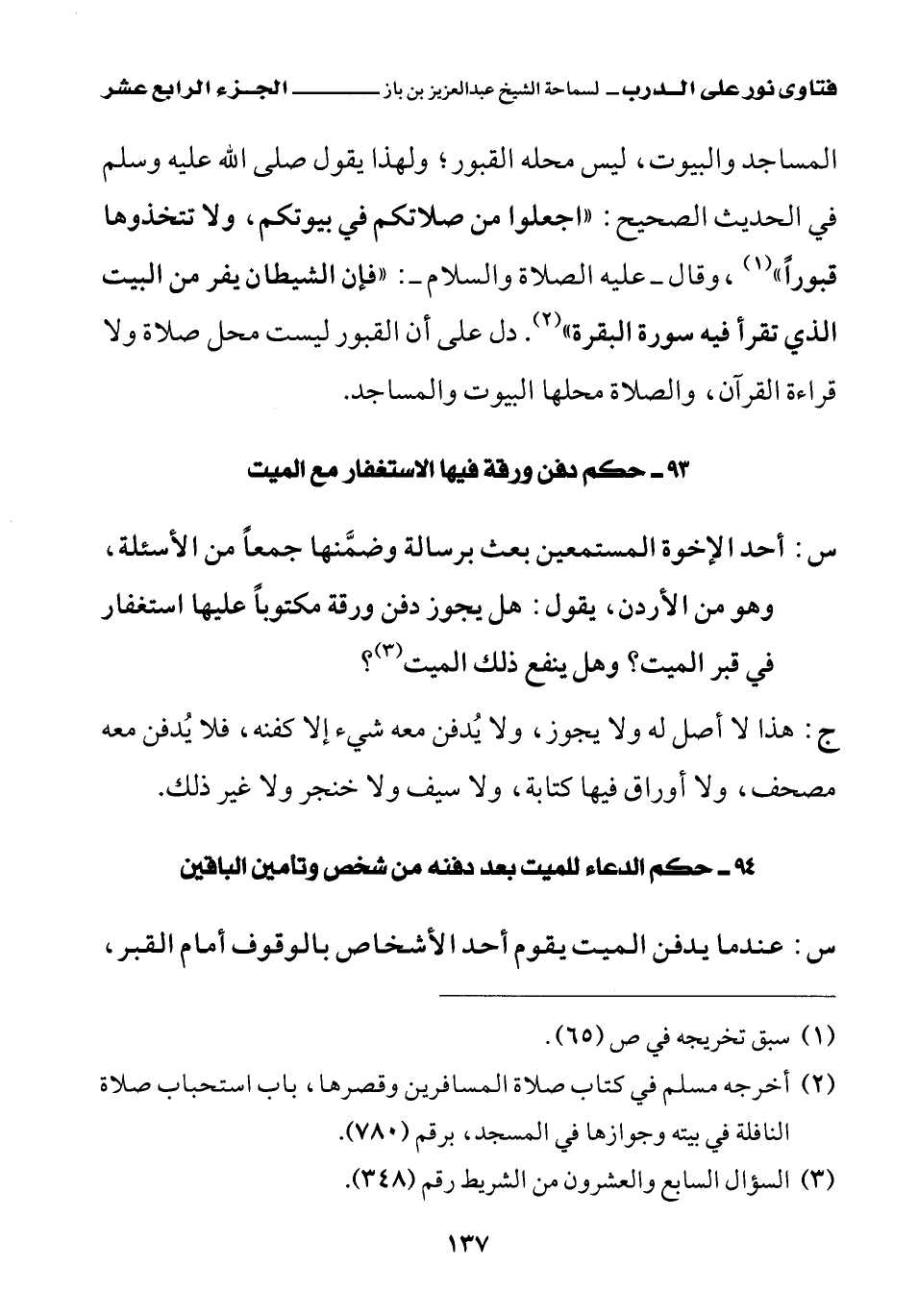 المساجد والبيوت، ليس محله القبور، ولهذا يقول صلى الله عليه وسلم في الحديث الصحيح: «اجعلوا من صلاتكم في بيوتكم، ولا تتخذوها قبورا (¬1)» وقال عليه الصلاة والسلام: «فإن الشيطان يفر من البيت الذي تقرأ فيه سورة البقرة (¬2)» دل على أن القبور ليست محل صلاة ولا قراءة القرآن، والصلاة محلها البيوت والمساجد.