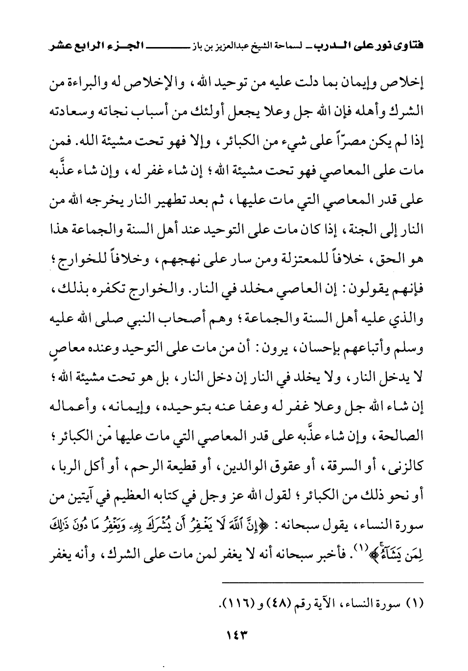 إخلاص وإيمان بما دلت عليه من توحيد الله، والإخلاص له والبراءة من الشرك وأهله، فإن الله جل وعلا يجعل أولئك من أسباب نجاته وسعادته إذا لم يكن مصرا على شيء من الكبائر، وإلا فهو تحت مشيئة الله، فمن مات على المعاصي فهو تحت مشيئة الله، إن شاء غفر له وإن شاء عذبه على قدر المعاصي التي مات عليها، ثم بعد تطهير النار يخرجه الله من النار إلى الجنة، إذا كان مات على التوحيد، عند أهل السنة والجماعة، هذا هو الحق، خلافا للمعتزلة ومن سار على نهجهم، وخلافا للخوارج فإنهم يقولون: إن العاصي مخلد في النار، والخوارج تكفره بذلك، والذي عليه أهل السنة والجماعة، وهم أصحاب النبي صلى الله عليه وسلم وأتباعهم بإحسان. يرون: أن من مات على التوحيد وعنده معاص لا يدخل النار، ولا يخلد في النار إن دخل النار، بل هو تحت مشيئة الله، إن شاء الله جل وعلا غفر له وعفا عنه بتوحيده وإيمانه وأعماله الصالحة، وإن شاء عذبه على قدر المعاصي التي مات عليها من الكبائر، كالزنى أو السرقة أو عقوق الوالدين أو قطيعة الرحم أو أكل الربا، أو نحو ذلك من الكبائر، لقول الله عز وجل في كتابه العظيم في آيتين من سورة النساء، يقول سبحانه: {إِنَّ اللَّهَ لَا يَغْفِرُ أَنْ يُشْرَكَ بِهِ وَيَغْفِرُ مَا دُونَ ذَلِكَ لِمَنْ يَشَاءُ} (¬1)، فأخبر سبحانه أنه لا يغفر لمن مات على الشرك، وأنه يغفر