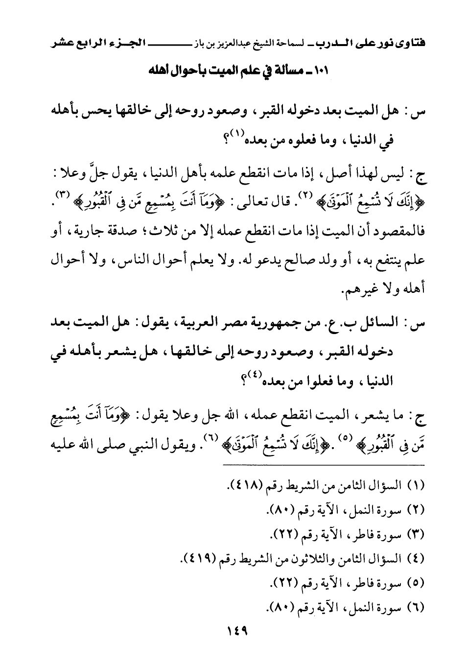 ج: ليس لهذا أصل، إذا مات انقطع علمه بأهل الدنيا، يقول جل وعلا: {إِنَّكَ لَا تُسْمِعُ الْمَوْتَى} (¬2)، قال تعالى: {وَمَا أَنْتَ بِمُسْمِعٍ مَنْ فِي الْقُبُورِ} (¬3)، فالمقصود أن الميت إذا مات انقطع عمله إلا من ثلاث: صدقة جارية، أو علم ينتفع به، أو ولد صالح يدعو له. ولا يعلم أحوال الناس، ولا أحوال أهله ولا غيرهم.