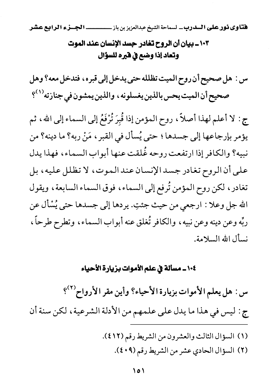 103 - بيان أن الروح تغادر جسد الإنسان عند الموت وتعاد إذا وضع في قبره للسؤال