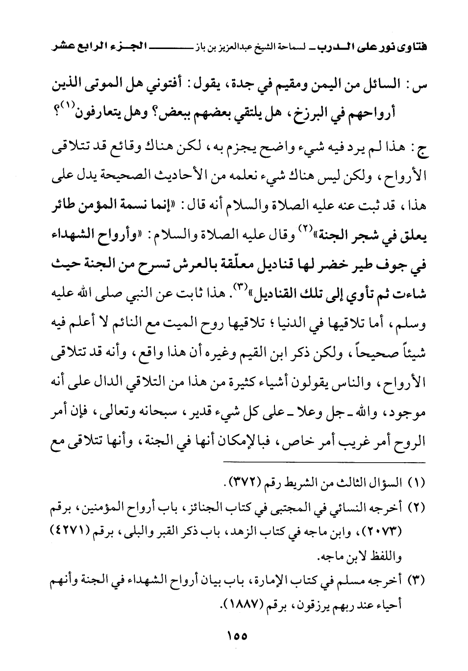 ج: هذا لم يرد فيه شيء واضح يجزم به، لكن هناك وقائع قد تتلاقى الأرواح، ولكن ليس هناك شيء نعلمه من الأحاديث الصحيحة يدل على هذا، قد ثبت عنه عليه الصلاة والسلام أنه قال: «إنما نسمة المؤمن طائر يعلق في شجر الجنة (¬2)» وقال عليه الصلاة والسلام: «وأرواح الشهداء في جوف طير خضر لها قناديل معلقة بالعرش تسرح من الجنة حيث شاءت ثم تأوي إلى تلك القناديل (¬3)» هذا ثابت عن النبي صلى الله عليه وسلم، أما تلاقيها في الدنيا، تلاقيها روح الميت مع النائم لا أعلم فيه شيئا صحيحا، ولكن ذكر ابن القيم وغيره أن هذا واقع، وأنه قد تتلاقى الأرواح، والناس يقولون أشياء كثيرة من هذا من التلاقي الدال على أنه موجود، والله جل وعلا على كل شيء قدير، سبحانه وتعالى، فإن أمر الروح أمر غريب أمر خاص، فبالإمكان أنها في الجنة، وأنها تتلاقى مع