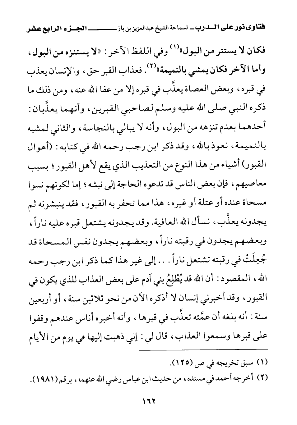 فكان لا يستتر من البول (¬1)» وفي اللفظ الآخر: «لا يستنزه من البول، وأما الآخر فكان يمشي بالنميمة (¬2)» فعذاب القبر حق، والإنسان يعذب في قبره، وبعض العصاة يعذب في قبره إلا من عفا الله عنه، ومن ذلك ما ذكره النبي صلى الله عليه وسلم لصاحبي القبرين، وأنهما يعذبان: أحدهما بعدم تنزهه من البول، وأنه لا يبالي بالنجاسة، والثاني لمشيه بالنميمة، نعوذ بالله، وقد ذكر ابن رجب رحمه الله في كتابه (أهوال القبور) أشياء من هذا النوع من التعذيب الذي يقع لأهل القبور، بسبب معاصيهم، فإن بعض الناس قد تدعوه الحاجة إلى نبشه، إما لكونهم نسوا مسحاة عنده أو عتلة أو غيره، هذا مما تحفر به القبور، فقد ينبشونه ثم يجدونه يعذب، نسأل الله العافية، وقد يجدونه يشتعل قبره عليه نارا، وبعضهم يجدون في رقبته نارا، وبعضهم يجدون نفس المسحاة قد جعلت في رقبته تشتعل نارا ... إلى غير هذا كما ذكر ابن رجب رحمه الله، المقصود أن الله قد يطلع بني آدم على بعض العذاب للذي يكون في القبور، وقد أخبرني إنسان لا أذكره الآن من نحو ثلاثين سنة، أو أربعين سنة: أنه بلغه أن عمته تعذب في قبرها، وأنه أخبره أناس عندهم وقفوا على قبرها وسمعوا العذاب، قال لي: إني ذهبت إليها في يوم من الأيام
