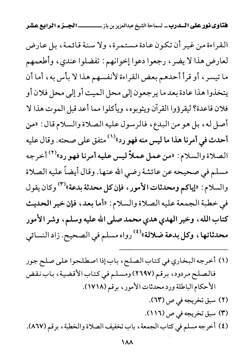 القراءة من غير أن تكون عادة مستمرة، ولا سنة قائمة، بل عارض لعارض هذا لا يضر، رجعوا دعوا إخوانهم، تفضلوا عندي، وأطعمهم ما تيسر، أو قرأ أحدهم بعض القراءة لأنفسهم هذا لا بأس به، أما أن يتخذوا هذا عادة بعدما يرجعون إلى محل الميت أو إلى محل فلان أو فلان قاعدة؟ ليقرؤوا القرآن ويثوبوه، ويأكلوا مما أعد قبل الموت هذا لا أصل له، بل هو من البدع، فالرسول عليه الصلاة والسلام قال: «من أحدث في أمرنا هذا ما ليس منه فهو رد (¬1)» متفق على صحته، وقال عليه الصلاة والسلام: «من عمل عملا ليس عليه أمرنا فهو رد (¬2)» أخرجه مسلم في صحيحه عن عائشة رضي الله عنها، وقال أيضا عليه الصلاة والسلام: «إياكم ومحدثات الأمور فإن كل محدثة بدعة (¬3)» وكان يقول في خطبة الجمعة عليه الصلاة والسلام: «أما بعد، فإن خير الحديث كتاب الله، وخير الهدي هدي محمد صلى الله عليه وسلم، وشر الأمور محدثاتها، وكل بدعة ضلالة (¬4)» رواه مسلم في الصحيح. زاد النسائي