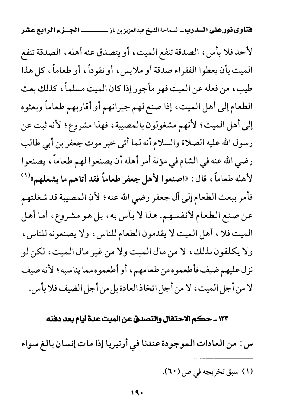 لأحد فلا بأس، الصدقة تنفع الميت، أو يتصدق عنه أهله، الصدقة تنفع الميت بأن يعطوا الفقراء صدقة أو ملابس، أو نقودا أو طعاما كل هذا طيب، من فعله عن الميت فهو مأجور إذا كان الميت مسلما، كذلك بعث الطعام إلى أهل الميت، إذا صنع لهم جيرانهم أو أقاربهم طعاما وبعثوه إلى أهل الميت، لأنهم مشغولون بالمصيبة، فهذا مشروع لأنه ثبت عن رسول الله عليه الصلاة والسلام أنه لما أتى خبر موت جعفر بن أبي طالب رضي الله عنه في الشام في مؤتة أمر أهله أن يصنعوا لهم طعاما، يصنعوا لأهله طعاما، قال: «اصنعوا لأهل جعفر طعاما فقد أتاهم ما يشغلهم (¬1)» فأمر ببعث الطعام إلى آل جعفر رضي الله عنه، لأن المصيبة قد شغلتهم عن صنع الطعام لأنفسهم، هذا لا بأس به، بل هو مشروع، أما أهل الميت فلا، أهل الميت لا يقدمون الطعام للناس، ولا يصنعونه للناس، ولا يكلفون بذلك، لا من مال الميت ولا من غير مال الميت، لكن لو نزل عليهم ضيف فأطعموه من طعامهم، أو أطعموا مما يناسبه، لأنه ضيف لا من أجل الميت، لا من أجل اتخاذ العادة بل من أجل الضيف فلا بأس.