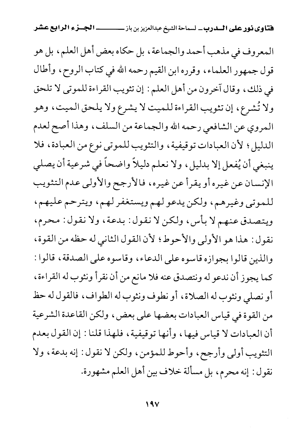المعروف في مذهب أحمد والجماعة، بل حكاه بعض أهل العلم، بل هو قول جمهور العلماء، وقرره ابن القيم رحمه الله في كتاب الروح، وأطال في ذلك، وقال آخرون من أهل العلم: إن تثويب القراءة للموتى لا تلحق ولا تشرع، إن تثويب القراءة للميت لا يشرع ولا يلحق الميت، وهو المروي عن الشافعي رحمه الله والجماعة من السلف، وهذا أصح لعدم الدليل، لأن العبادات توقيفية، والتثويب للموتى نوع من العبادة، فلا ينبغي أن يفعل إلا بدليل، ولا نعلم دليلا واضحا في شرعية أن يصلي الإنسان عن غيره أو يقرأ عن غيره، فالأرجح والأولى عدم التثويب للموتى وغيرهم، ولكن يدعو لهم ويستغفر لهم، ويترحم عليهم، ويتصدق عنهم لا بأس، ولكن لا نقول: بدعة ولا نقول: محرم نقول: هذا هو الأولى والأحوط، لأن القول الثاني له حظه من القوة، والذين قالوا بجوازه قاسوه على الدعاء وقاسوه على الصدقة، قالوا: كما يجوز أن ندعو له ونتصدق عنه فلا مانع من أن نقرأ ونثوب له القراءة، أو نصلي ونثوب له الصلاة، أو نطوف ونثوب له الطواف، فالقول له حظ من القوة في قياس العبادات بعضها على بعض، ولكن القاعدة الشرعية أن العبادات لا قياس فيها، وأنها توقيفية فلهذا قلنا: إن القول بعدم التثويب أولى وأرجح وأحوط للمؤمن، ولكن لا نقول: إنه بدعة، ولا نقول: إنه محرم بل مسألة خلاف بين أهل العلم مشهورة.