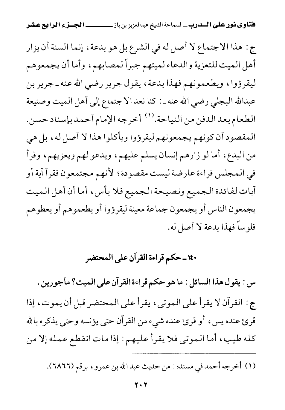 ج: هذا الاجتماع لا أصل له في الشرع بل هو بدعة، إنما السنة أن يزار أهل الميت للتعزية والدعاء لميتهم جبرا لمصابهم، وأما أن يجمعوهم ليقرؤوا ويطعمونهم فهذا بدعة، يقول جرير رضي الله عنه - جرير بن عبد الله البجلي رضي الله عنه: «كنا نعد الاجتماع إلى أهل الميت وصنيعة الطعام بعد الدفن من النياحة (¬1)» أخرجه الإمام أحمد بإسناد حسن، المقصود أن كونهم يجمعونهم ليقرؤوا ويأكلوا هذا لا أصل له، بل هي من البدع، أما لو زارهم إنسان يسلم عليهم، ويدعو لهم ويعزيهم، وقرأ في المجلس قراءة عارضة ليست مقصودة، لأنهم مجتمعون فقرأ آية أو آيات لفائدة الجميع ونصيحة الجميع فلا بأس، أما أن أهل الميت يجمعون الناس أو يجمعون جماعة معنية ليقرؤوا أو يطعموهم أو يعطوهم فلوسا فهذا بدعة لا أصل له.