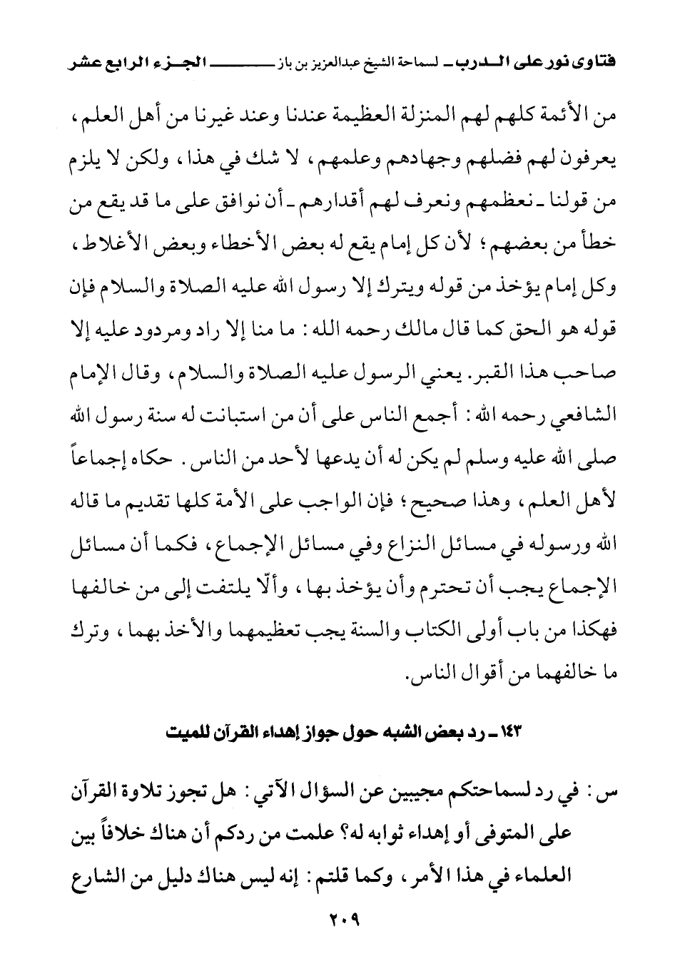 من الأئمة كلهم لهم المنزلة العظيمة عندنا، وعند غيرنا من أهل العلم، يعرفون لهم فضلهم وجهادهم وعلمهم، لا شك في هذا، ولكن لا يلزم من قولنا - نعظمهم ونعرف لهم أقدارهم - أن نوافق على ما قد يقع من خطأ من بعضهم، لأن كل إمام يقع له بعض الأخطاء وبعض الأغلاط، وكل إمام يؤخذ من قوله ويترك إلا رسول الله عليه الصلاة والسلام، فإن قوله هو الحق كما قال مالك رحمه الله: ما منا إلا راد ومردود عليه إلا صاحب هذا القبر، يعني الرسول عليه الصلاة والسلام، وقال الإمام الشافعي رحمه الله: أجمع الناس على أن من استبانت له سنة رسول الله صلى الله عليه وسلم لم يكن له أن يدعها لأحد من الناس، حكاه إجماعا لأهل العلم، وهذا صحيح، فإن الواجب على الأمة كلها تقديم ما قاله الله ورسوله في مسائل النزاع وفي مسائل الإجماع، فكما أن مسائل الإجماع يجب أن تحترم وأن يؤخذ بها، وألا يلتفت إلى من خالفها فهكذا من باب أولى الكتاب والسنة يجب تعظيمهما والأخذ بهما، وترك ما خالفهما من أقوال الناس.