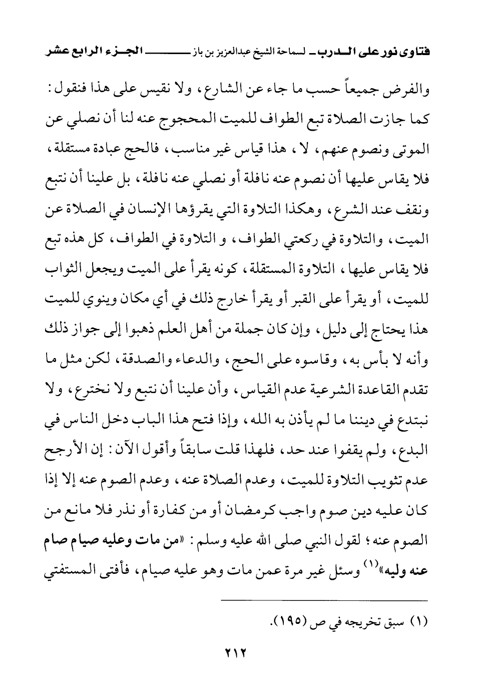 والفرض جميعا حسب ما جاء عن الشارع، ولا نقيس على هذا فنقول: كما جازت الصلاة تبع الطواف للميت المحجوج عنه لنا أن نصلي عن الموتى ونصوم عنهم، لا، هذا قياس غير مناسب، فالحج عبادة مستقلة، فلا يقاس عليها أن نصوم عنه نافلة أو نصلي عنه نافلة، بل علينا أن نتبع ونقف عند الشرع، وهكذا التلاوة التي يقرؤها الإنسان في الصلاة عن الميت، والتلاوة في ركعتي الطواف، والتلاوة في الطواف، كل هذه تبع فلا يقاس عليها، التلاوة المستقلة، كونه يقرأ على الميت ويجعل الثواب للميت، أو يقرأ على القبر أو يقرأ خارج ذلك في أي مكان وينوي للميت هذا يحتاج إلى دليل، وإن كان جملة من أهل العلم ذهبوا إلى جواز ذلك وأنه لا بأس به، وقاسوه على الحج، والدعاء والصدقة، لكن مثل ما تقدم القاعدة الشرعية عدم القياس، وأن علينا أن نتبع ولا نخترع، ولا نبتدع في ديننا ما لم يأذن به الله، وإذا فتح هذا الباب دخل الناس في البدع، ولم يقفوا عند حد، فلهذا قلت سابقا وأقول الآن: إن الأرجح عدم تثويب التلاوة للميت، وعدم الصلاة عنه، وعدم الصوم عنه إلا إذا كان عليه دين صوم واجب كرمضان أو من كفارة أو نذر فلا مانع من الصوم عنه، لقول النبي صلى الله عليه وسلم: «من مات وعليه صيام صام عنه وليه (¬1)» وسئل غير مرة عمن مات وهو عليه صيام، فأفتى المستفتي