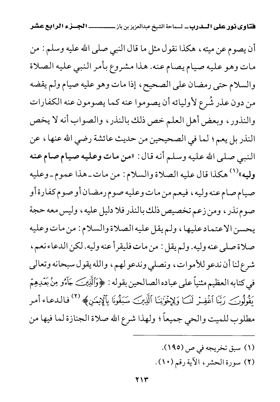 أن يصوم عن ميته، هكذا نقول مثل ما قال النبي صلى الله عليه وسلم: «من مات وهو عليه صيام يصام عنه (¬1)»، هذا مشروع بأمر النبي عليه الصلاة والسلام حتى رمضان على الصحيح، إذا مات وهو عليه صيام ولم يقضه من دون عذر شرع لأوليائه أن يصوموا عنه كما يصومون عنه الكفارات والنذور، وبعض أهل العلم خص ذلك بالنذر، والصواب أنه لا يخص النذر بل يعم، لما في الصحيحين من حديث عائشة رضي الله عنها، عن النبي صلى الله عليه وسلم أنه قال: «من مات وعليه صيام صام عنه وليه (¬2)» هكذا قال عليه الصلاة والسلام: من مات - هذا عموم - وعليه صيام صام عنه وليه، فيعم من مات وعليه صوم رمضان أو صوم كفارة أو صوم نذر، ومن زعم تخصيص ذلك بالنذر فلا دليل عليه، وليس معه حجة يحسن الاعتماد عليها، ولم يقل عليه الصلاة والسلام من مات وعليه صلاة صلى عنه وليه، ولم يقل: من مات فليقرأ عنه وليه. لكن الدعاء نعم شرع لنا أن ندعو للأموات ونصلي وندعو لهم، والله يقول سبحانه وتعالى في كتابه العظيم مثنيا على عباده الصالحين بقوله: {وَالَّذِينَ جَاءُوا مِنْ بَعْدِهِمْ يَقُولُونَ رَبَّنَا اغْفِرْ لَنَا وَلِإِخْوَانِنَا الَّذِينَ سَبَقُونَا بِالْإِيمَانِ} (¬3) فالدعاء أمر مطلوب للميت والحي جميعا، ولهذا شرع الله صلاة الجنازة لما فيها من