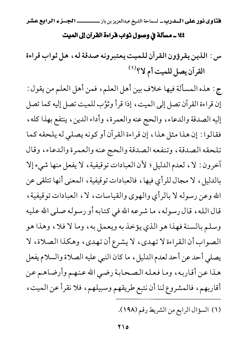 144 - مسألة في وصول ثواب قراءة القرآن إلى الميت