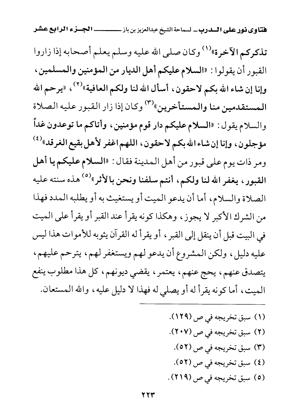 تذكركم الآخرة (¬1)» وكان صلى الله عليه وسلم يعلم أصحابه إذا زاروا القبور أن يقولوا: «السلام عليكم أهل الديار من المؤمنين والمسلمين، وإنا إن شاء الله بكم لاحقون، أسأل الله لنا ولكم العافية (¬2)» «يرحم الله المستقدمين منا والمستأخرين (¬3)» وكان إذا زار القبور عليه الصلاة والسلام يقول: «السلام عليكم دار قوم مؤمنين وأتاكم ما توعدون غدا مؤجلون وإنا إن شاء الله بكم لاحقون اللهم اغفر لأهل بقيع الغرقد (¬4)» ومر ذات يوم على قبور من أهل المدينة فقال: «السلام عليكم يا أهل القبور يغفر الله لنا ولكم، أنتم سلفنا ونحن بالأثر (¬5)» هذه سنته عليه الصلاة والسلام أما أن يدعو الميت أو يستغيث به أو يطلبه المدد فهذا من الشرك الأكبر لا يجوز، وهكذا كونه يقرأ عند القبر أو يقرأ على الميت في البيت قبل أن ينقل إلى القبر، أو يقرأ له القرآن يثوبه للأموات هذا ليس عليه دليل، ولكن المشروع أن يدعو لهم ويستغفر لهم، يترحم عليهم، يتصدق عنهم، يحج عنهم، يعتمر، يقضي ديونهم، كل هذا مطلوب ينفع الميت، أما كونه يقرأ له أو يصلي له فهذا لا دليل عليه، والله المستعان.