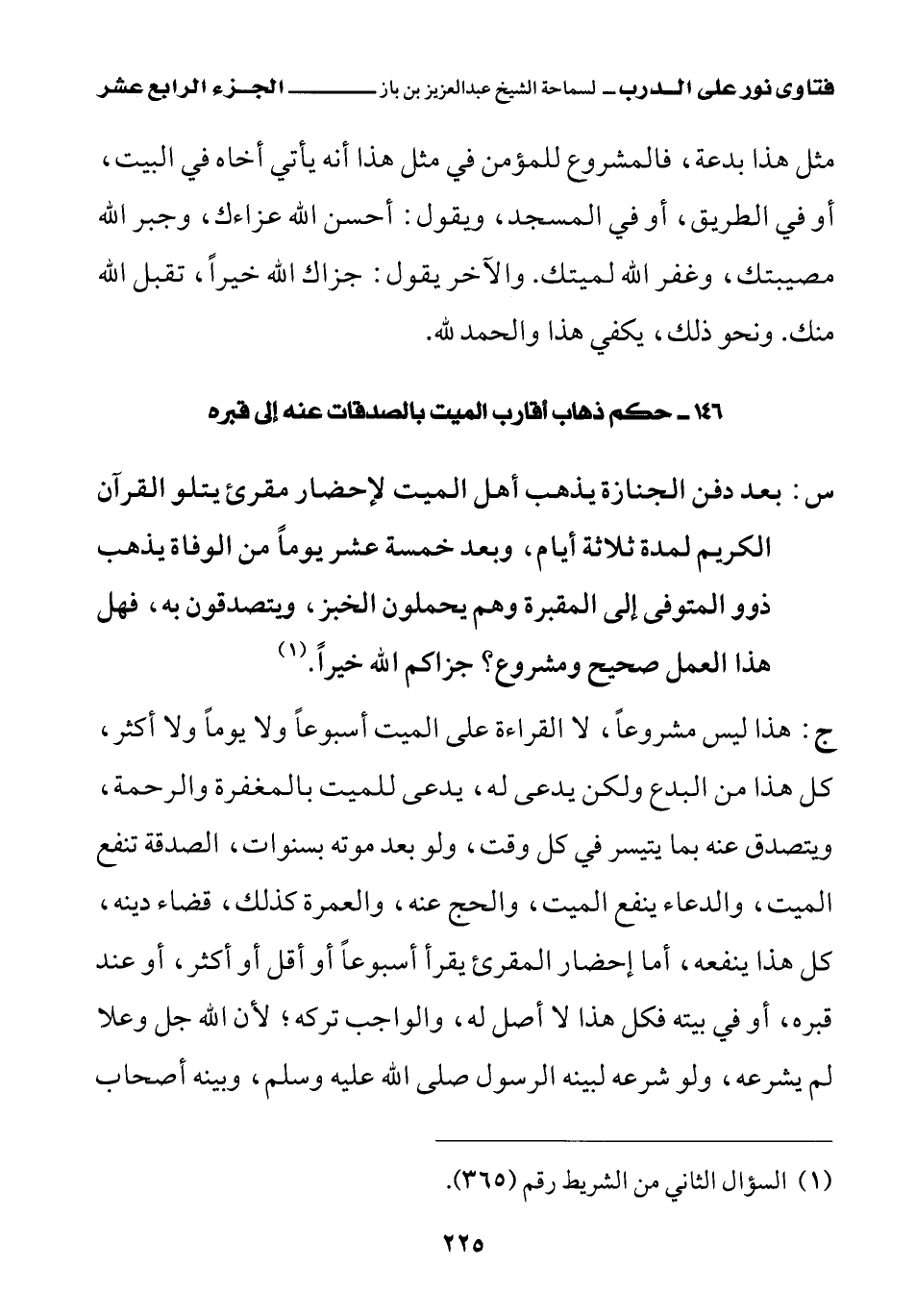 146 - حكم ذهاب أقارب الميت بالصدقات عنه إلى قبره