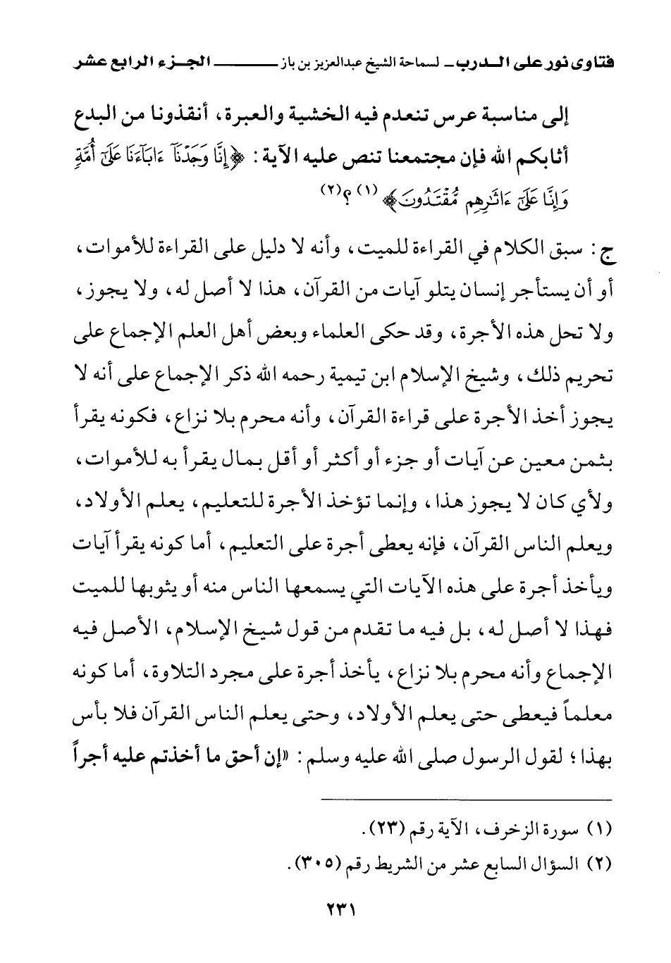 ج: سبق الكلام في القراءة للميت، وأنه لا دليل على القراءة للأموات، أو أن يستأجر إنسان يتلو آيات من القرآن، هذا لا أصل له، ولا يجوز ولا تحل هذه الأجرة، وقد حكى العلماء وبعض أهل العلم الإجماع على تحريم ذلك، وشيخ الإسلام ابن تيمية رحمه الله ذكر الإجماع على أنه لا يجوز أخذ الأجرة على قراءة القرآن، وأنه محرم بلا نزاع، فكونه يقرأ بثمن معين عن آيات أو جزء أو أكثر أو أقل بمال يقرأ به للأموات ولأي كان لا يجوز هذا، وإنما تؤخذ الأجرة للتعليم، يعلم الأولاد، ويعلم الناس القرآن، فإنه يعطى أجرة على التعليم، أما كونه يقرأ آيات ويأخذ أجرة على هذه الآيات التي يسمعها الناس منه أو يثوبها للميت فهذا لا أصل له، بل فيه ما تقدم من قول شيخ الإسلام، الأصل فيه الإجماع وأنه محرم بلا نزاع، يأخذ أجرة على مجرد التلاوة، أما كونه معلما فيعطى حتى يعلم الأولاد، وحتى يعلم الناس القرآن فلا بأس بهذا، لقول الرسول صلى الله عليه وسلم: «إن أحق ما أخذتم عليه أجرا