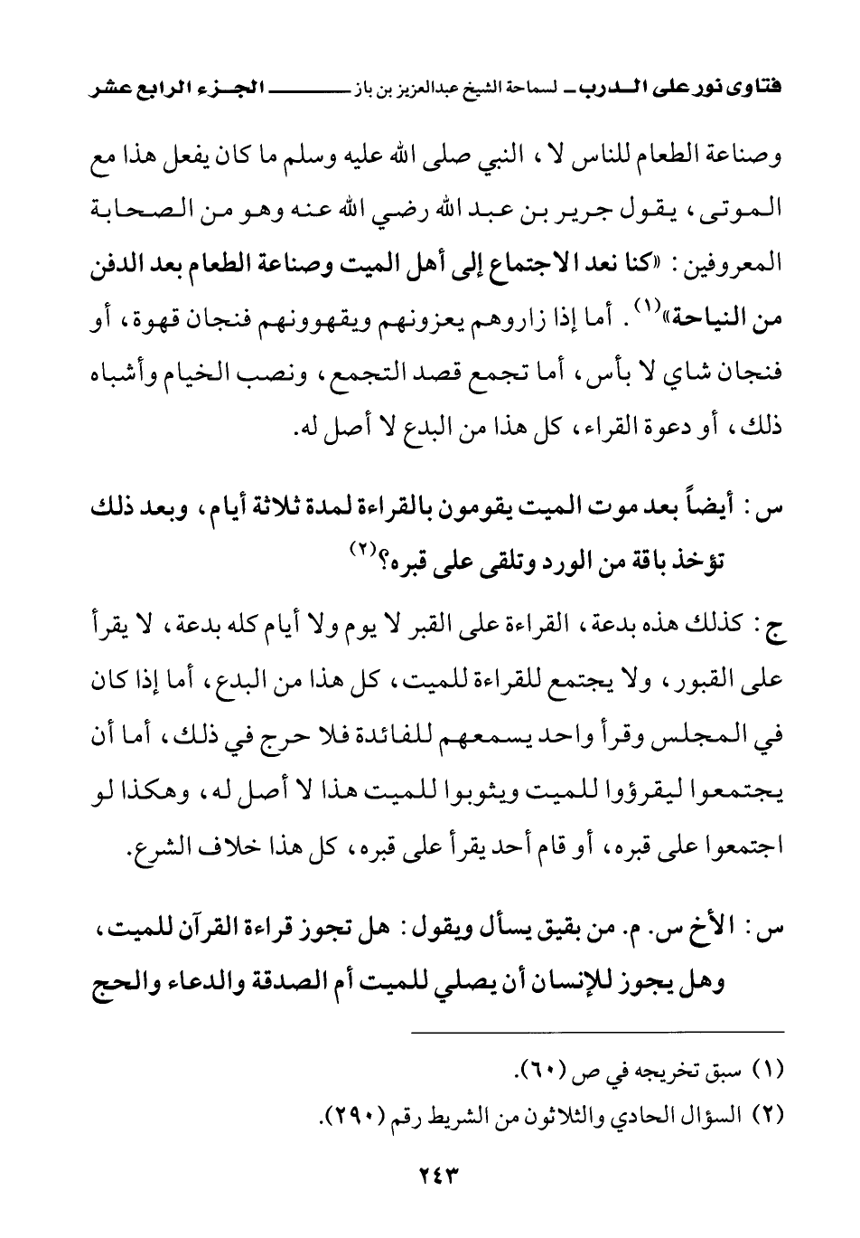 وصناعة الطعام للناس لا، النبي صلى الله عليه وسلم ما كان يفعل هذا مع الموتى، يقول جرير بن عبد الله رضي الله عنه وهو من الصحابة المعروفين: «كنا نعد الاجتماع إلى أهل الميت وصناعة الطعام بعد الدفن من النياحة (¬1)» أما إذا زاروهم يعزونهم ويقهوونهم فنجان قهوة، أو فنجان شاي لا بأس، أما تجمع قصد التجمع ونصب الخيام وأشباه ذلك، أو دعوة القراء، كل هذا من البدع لا أصل له.