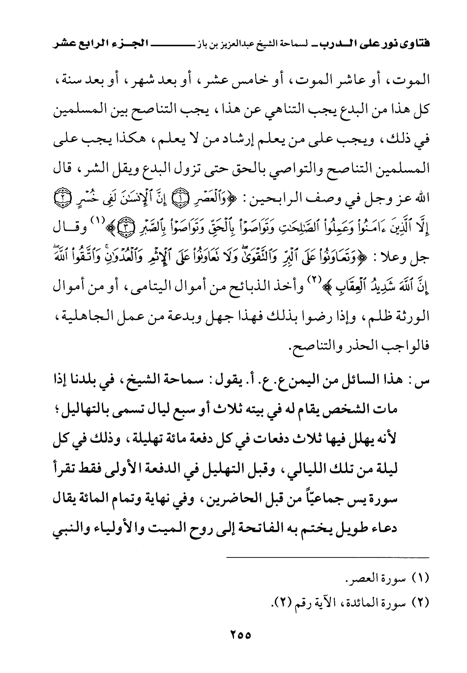 الموت أو عاشر الموت، أو خامس عشر، أو بعد شهر، أو بعد سنة، كل هذا من البدع يجب التناهي عن هذا، يجب التناصح بين المسلمين في ذلك، ويجب على من يعلم إرشاد من لا يعلم، هكذا يجب على المسلمين التناصح والتواصي بالحق حتى تزول البدع ويقل الشر، قال الله عز وجل في وصف الرابحين: {وَالْعَصْرِ} (¬1) {إِنَّ الْإِنْسَانَ لَفِي خُسْرٍ} (¬2) {إِلَّا الَّذِينَ آمَنُوا وَعَمِلُوا الصَّالِحَاتِ وَتَوَاصَوْا بِالْحَقِّ وَتَوَاصَوْا بِالصَّبْرِ} (¬3) وقال جل وعلا: {وَتَعَاوَنُوا عَلَى الْبِرِّ وَالتَّقْوَى وَلَا تَعَاوَنُوا عَلَى الْإِثْمِ وَالْعُدْوَانِ وَاتَّقُوا اللَّهَ إِنَّ اللَّهَ شَدِيدُ الْعِقَابِ} (¬4) وأخذ الذبائح من أموال اليتامى، أو من أموال الورثة ظلم، وإذا رضوا بذلك فهذا جهل وبدعة من عمل الجاهلية، فالواجب الحذر والتناصح.