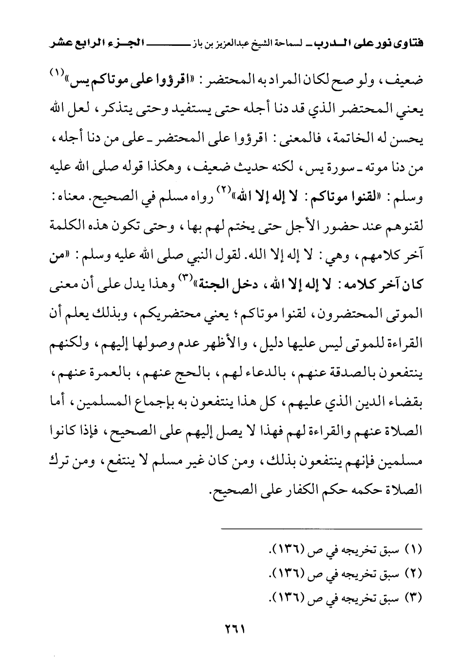 ضعيف، ولو صح لكان المراد به المحتضر: «اقرؤوا على موتاكم يس (¬1)» يعني: المحتضر الذي قد دنا أجله حتى يستفيد وحتى يتذكر، لعل الله يحسن له الخاتمة، فالمعنى: اقرؤوا على المحتضر - على من دنا أجله، من دنا موته - سورة يس، لكنه حديث ضعيف، وهكذا قوله صلى الله عليه وسلم: «لقنوا موتاكم: لا إله إلا الله (¬2)» رواه مسلم في الصحيح، معناه: لقنوهم عند حضور الأجل حتى يختم لهم بها، وحتى تكون هذه الكلمة آخر كلامهم، وهي: لا إله إلا الله، لقول النبي صلى الله عليه وسلم: «من كان آخر كلامه: لا إله إلا الله دخل الجنة (¬3)» وهذا يدل على أن معنى الموتى المحتضرون، لقنوا موتاكم، يعني: محتضريكم، وبذلك يعلم أن القراءة للموتى ليس عليها دليل، والأظهر عدم وصولها إليهم، ولكنهم ينتفعون بالصدقة عنهم، بالدعاء لهم، بالحج عنهم، بالعمرة عنهم، بقضاء الدين الذي عليهم، كل هذا ينتفعون به بإجماع المسلمين، أما الصلاة عنهم والقراءة لهم فهذا لا يصل إليهم على الصحيح، فإذا كانوا مسلمين فإنهم ينتفعون بذلك، ومن كان غير مسلم لا ينتفع، ومن ترك الصلاة حكمه حكم الكفار على الصحيح.