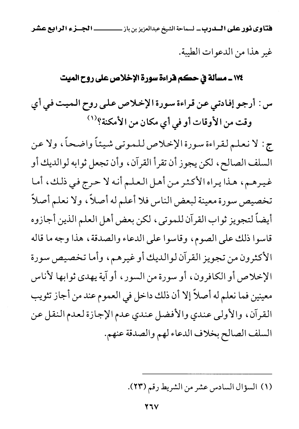 174 - مسألة في حكم قراءة سورة الإخلاص على روح الميت