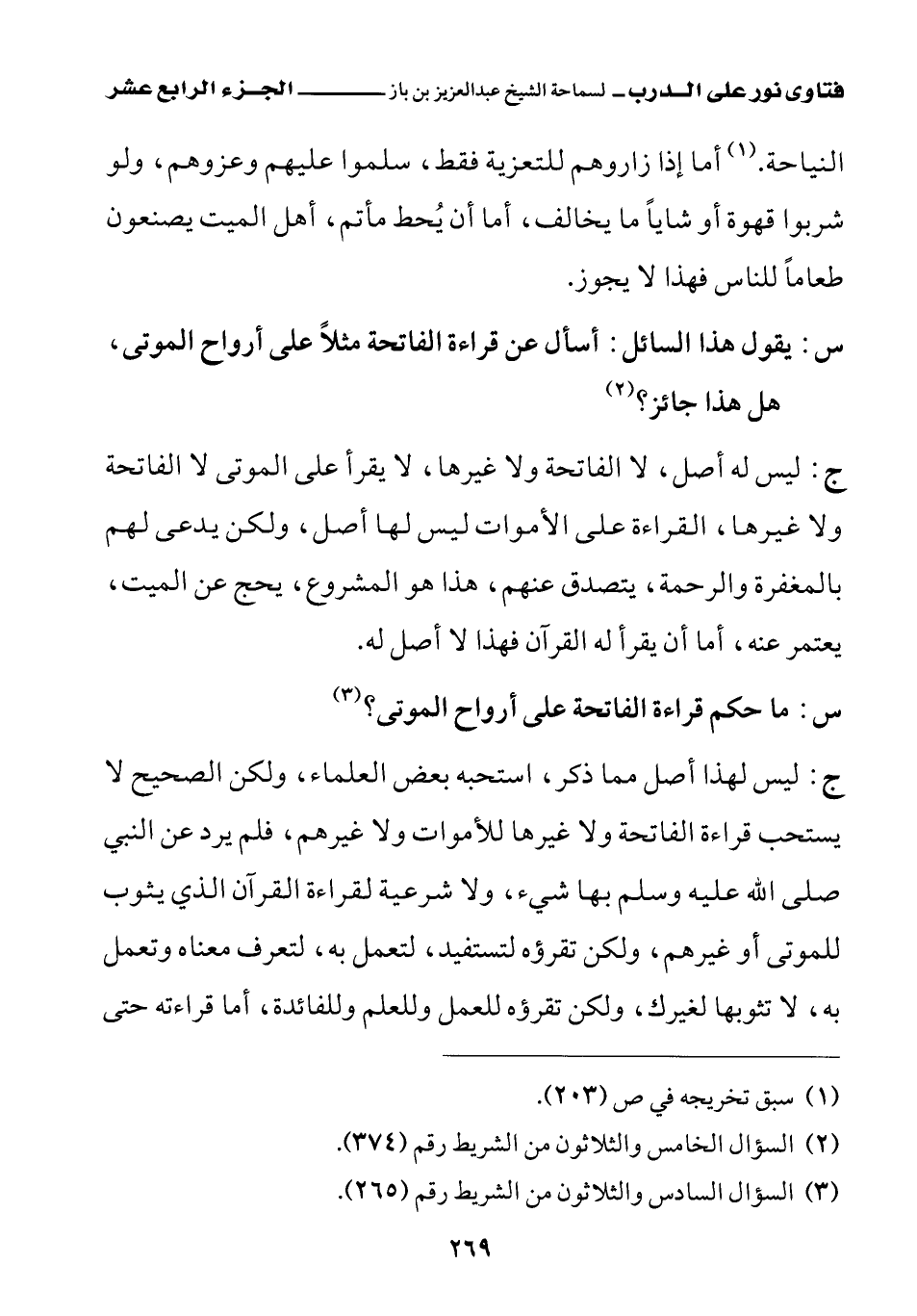س: يقول هذا السائل: أسأل عن قراءة الفاتحة مثلا على أرواح الموتى، هل هذا جائز؟ (¬1)
