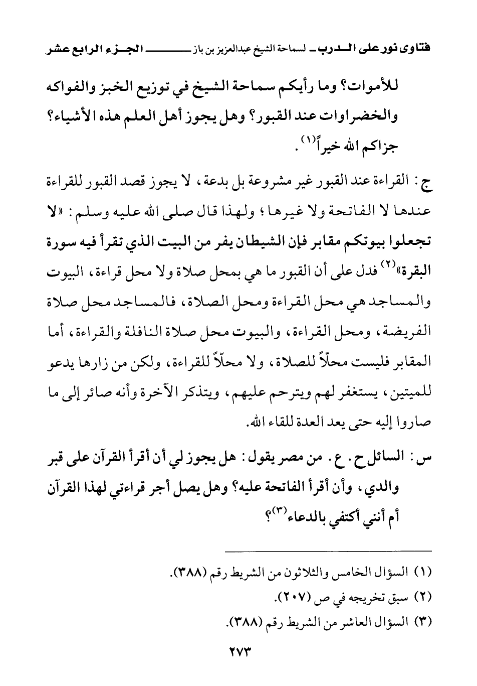 ج: القراءة عند القبور غير مشروعة بل بدعة، لا يجوز قصد القبور للقراءة عندها لا الفاتحة ولا غيرها، ولهذا قال صلى الله عليه وسلم: «لا تجعلوا بيوتكم مقابر، فإن الشيطان يفر من البيت الذي تقرأ فيه سورة البقرة (¬2)» فدل على أن القبور ما هي بمحل صلاة ولا محل قراءة، البيوت والمساجد هي محل القراءة، ومحل الصلاة، فالمساجد محل صلاة الفريضة، ومحل القراءة، والبيوت محل صلاة النافلة والقراءة، أما المقابر فليست محلا للصلاة، ولا محلا للقراءة، ولكن من زارها يدعو للميتين، يستغفر لهم ويترحم عليهم ويتذكر الآخرة وأنه صائر إلى ما صاروا إليه حتى يعد العدة للقاء الله.