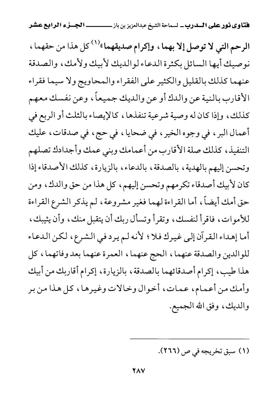 الرحم التي لا توصل إلا بهما، وإكرام صديقهما (¬1)» كل هذا من حقهما، نوصيك أيها السائل بكثرة الدعاء لوالديك لأبيك ولأمك، والصدقة عنهما كذلك بالقليل والكثير على الفقراء والمحاويج، ولا سيما فقراء الأقارب بالنية عن والدك أو عن والديك جميعا، وعن نفسك معهم كذلك، وإذا كان له وصية شرعية تنفذها، كالإيصاء بالثلث أو الربع في أعمال البر، في وجوه الخير، في ضحايا، في حج، في صدقات، عليك التنفيذ كذلك صلة الأقارب من أعمامك وبني عمك وأجدادك، تصلهم وتحسن إليهم بالهدية، بالصدقة بالدعاء، بالزيارة، كذلك الأصدقاء، إذا كان لأبيك أصدقاء تكرمهم وتحسن إليهم، كل هذا من حق والدك، ومن حق أمك أيضا، أما القراءة لهما فغير مشروعة، لم يذكر الشرع القراءة للأموات، فاقرأ لنفسك، وتقرأ وتسأل ربك أن يتقبل منك، وأن يثيبك، أما إهداء القرآن إلى غيرك فلا، لأنه لم يرد في الشرع لكن الدعاء للوالدين والصدقة عنهما، الحج عنهما، العمرة عنهما بعد وفاتهما، كل هذا طيب، إكرام أصدقائهما بالصدقة، بالزيارة، إكرام أقاربك من أبيك وأمك من أعمام، عمات، أخوال وخالات وغيرها، كل هذا من بر والديك، وفق الله الجميع.
