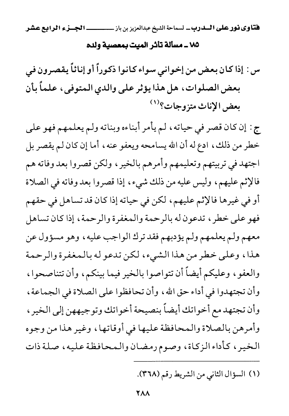 س: إذا كان بعض من إخواني سواء كانوا ذكورا أو إناثا يقصرون في بعض الصلوات، هل هذا يؤثر على والدي المتوفى، علما بأن بعض الإناث متزوجات؟ (¬1)