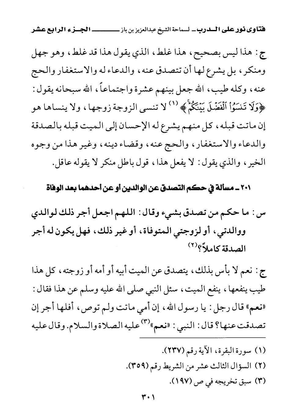 201 - مسألة في حكم التصدق عن الوالدين أو عن أحدهما بعد الوفاة