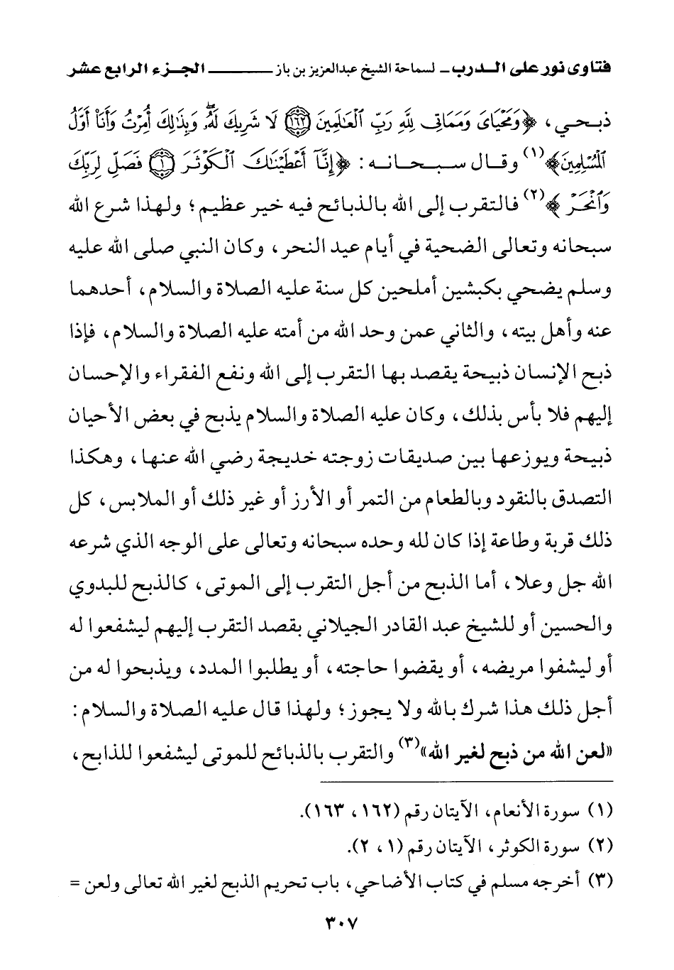 ذبحي: {وَمَحْيَايَ وَمَمَاتِي لِلَّهِ رَبِّ الْعَالَمِينَ} (¬1) {لَا شَرِيكَ لَهُ وَبِذَلِكَ أُمِرْتُ وَأَنَا أَوَّلُ الْمُسْلِمِينَ} (¬2)، وقال سبحانه: {إِنَّا أَعْطَيْنَاكَ الْكَوْثَرَ} (¬3) {فَصَلِّ لِرَبِّكَ وَانْحَرْ} (¬4) فالتقرب إلى الله بالذبائح فيه خير عظيم، ولهذا شرع الله سبحانه وتعالى الضحية في أيام عيد النحر، وكان النبي صلى الله عليه وسلم يضحي بكبشين أملحين كل سنة، عليه الصلاة والسلام، أحدهما عنه وأهل بيته، والثاني عمن وحد الله من أمته عليه الصلاة والسلام، فإذا ذبح الإنسان ذبيحة يقصد بها التقرب إلى الله ونفع الفقراء والإحسان إليهم، فلا بأس بذلك، وكان عليه الصلاة والسلام يذبح في بعض الأحيان ذبيحة، ويوزعها بين صديقات زوجته خديجة رضي الله عنها، وهكذا التصدق بالنقود وبالطعام من التمر، أو الأرز أو غير ذلك أو الملابس، كل ذلك قربة وطاعة إذا كان لله وحده سبحانه وتعالى على الوجه الذي شرعه الله جل وعلا، أما الذبح من أجل التقرب إلى الموتى، كالذبح للبدوي والحسين أو للشيخ عبد القادر الجيلاني بقصد التقرب إليهم، ليشفعوا له أو ليشفوا مريضه، أو يقضوا حاجته، أو يطلبوا المدد، ويذبحوا له من أجل ذلك هذا شرك بالله ولا يجوز، ولهذا قال عليه الصلاة والسلام: «لعن الله من ذبح لغير الله (¬5)» والتقرب بالذبائح للموتى ليشفعوا للذابح