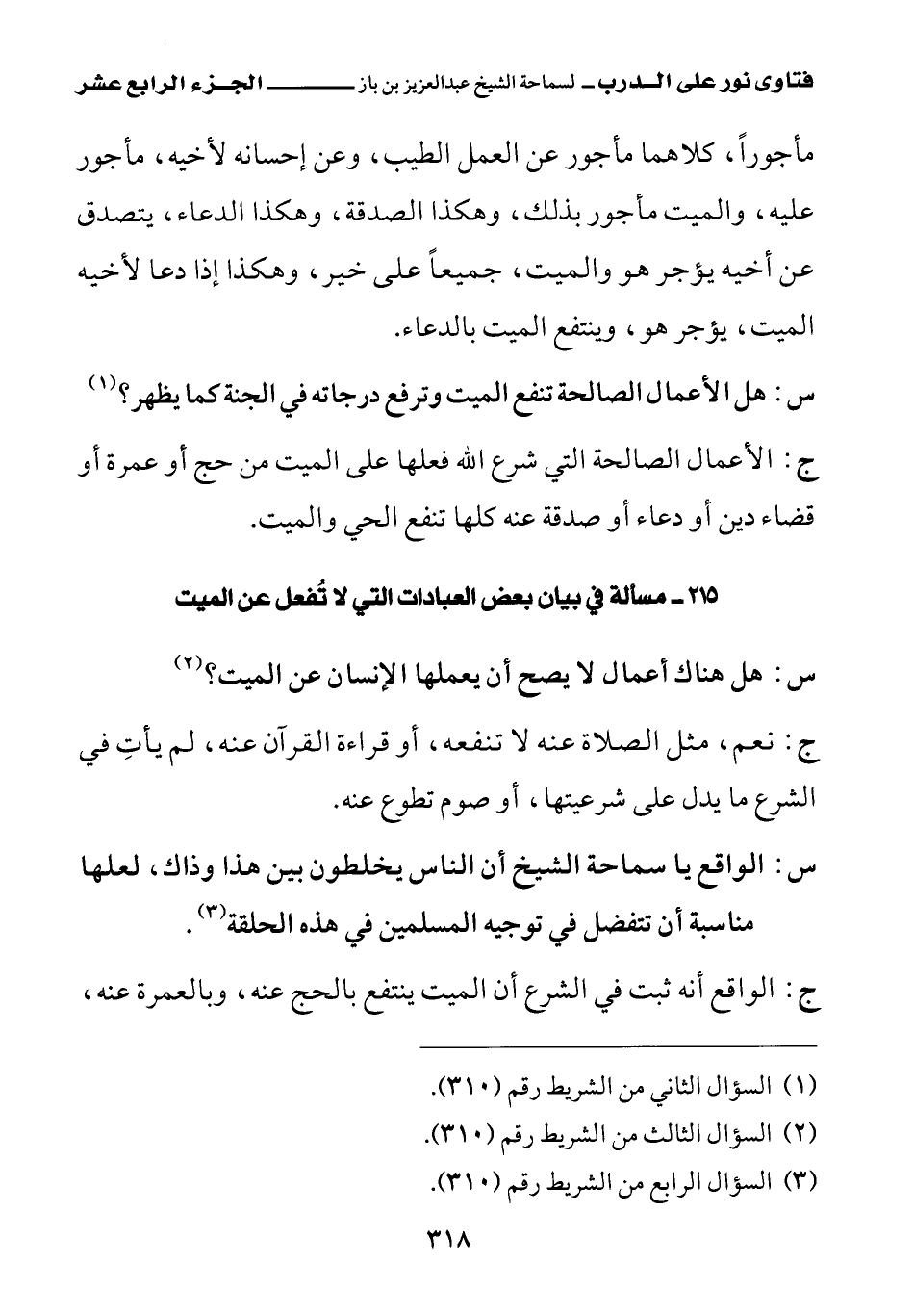 215 - مسألة في بيان بعض العبادات التي لا تفعل عن الميت