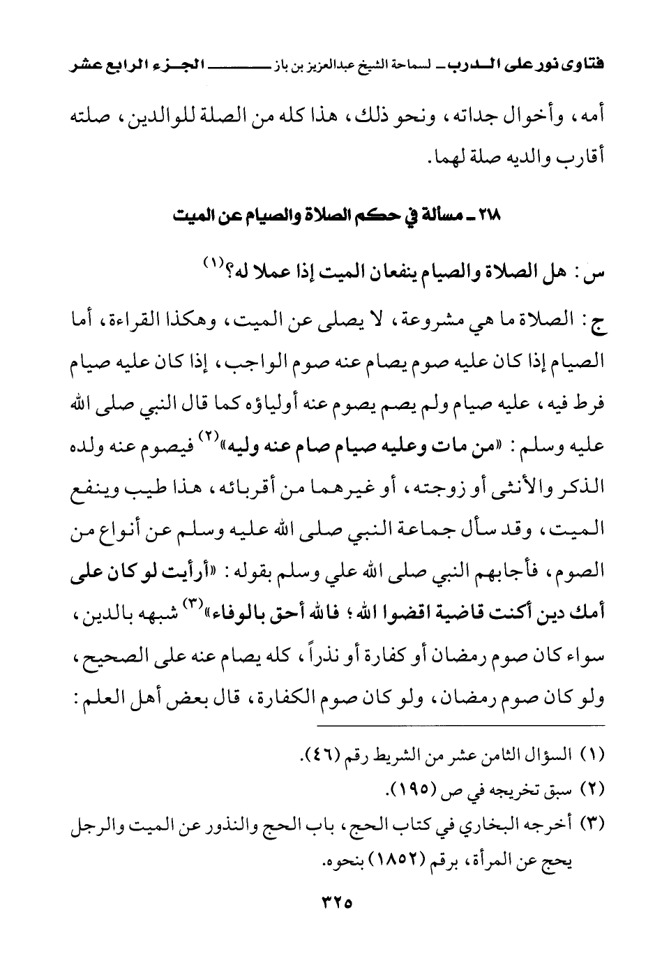 218 - مسألة في حكم الصلاة والصيام عن الميت