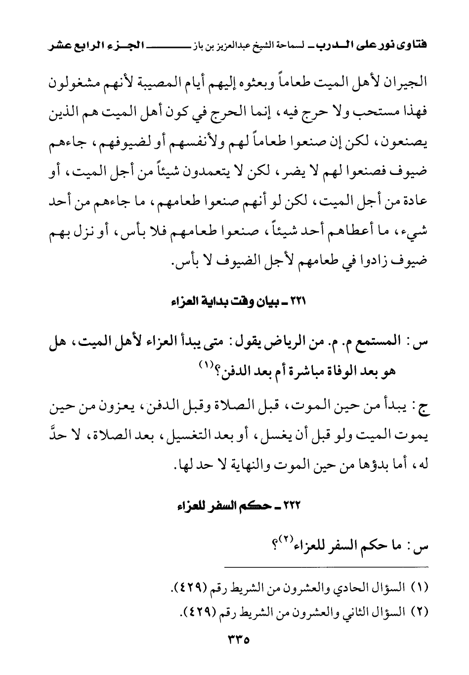 س: المستمع م. م. من الرياض يقول: متى يبدأ العزاء لأهل الميت، هل هو بعد الوفاة مباشرة أم بعد الدفن؟ (¬1)