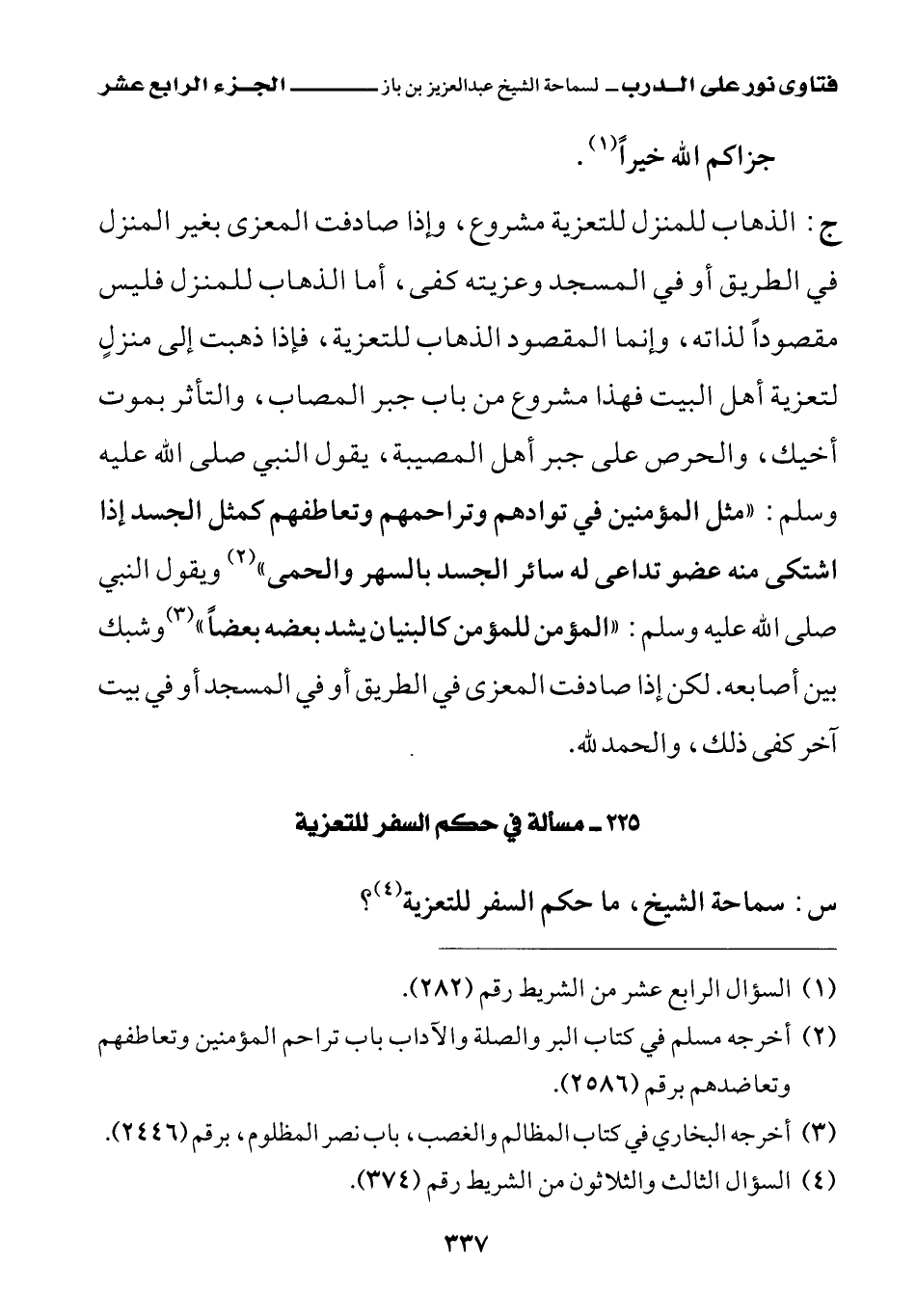 ج: الذهاب للمنزل للتعزية مشروع، وإذا صادفت المعزى بغير المنزل في الطريق أو في المسجد وعزيته كفى، أما الذهاب للمنزل فليس مقصودا لذاته، وإنما المقصود الذهاب للتعزية فإذا ذهبت إلى منزل لتعزية أهل البيت فهذا مشروع من باب جبر المصاب، والتأثر بموت أخيك، والحرص على جبر أهل المصيبة، يقول النبي صلى الله عليه وسلم: «مثل المؤمنين في توادهم وتراحمهم وتعاطفهم كمثل الجسد، إذا اشتكى منه عضو تداعى له سائر الجسد بالسهر والحمى (¬2)» ويقول النبي صلى الله عليه وسلم: «المؤمن للمؤمن كالبنيان يشد بعضه بعضا (¬3)» وشبك بين أصابعه، لكن إذا صادفت المعزى في الطريق أو في المسجد أو في بيت آخر كفى ذلك، والحمد لله.
