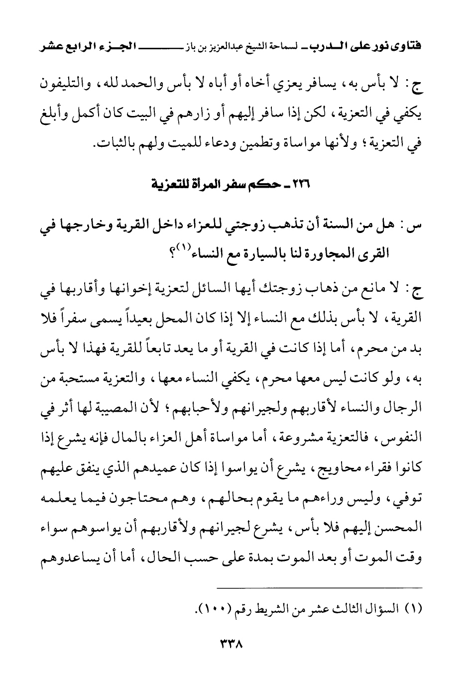 ج: لا مانع من ذهاب زوجتك أيها السائل لتعزية إخوانها وأقاربها في القرية، لا بأس بذلك مع النساء إلا إذا كان المحل بعيدا يسمى سفرا فلا بد من محرم، أما إذا كانت في القرية أو ما يعد تابعا للقرية فهذا لا بأس به، ولو كانت ليس معها محرم، يكفي النساء معها، والتعزية مستحبة من الرجال والنساء لأقاربهم ولجيرانهم ولأحبائهم؛ لأن المصيبة لها أثر في النفوس، فالتعزية مشروعة، أما مواساة أهل العزاء بالمال فإنه يشرع إذا كانوا فقراء محاويج، يشرع أن يواسوا إذا كان عميدهم الذي ينفق عليهم توفي، وليس وراءهم ما يقوم بحالهم، وهم محتاجون فيما يعلمه المحسن إليهم فلا بأس، يشرع لجيرانهم ولأقاربهم أن يواسوهم سواء وقت الموت أو بعد الموت بمدة على حسب الحال، أما أن يساعدوهم