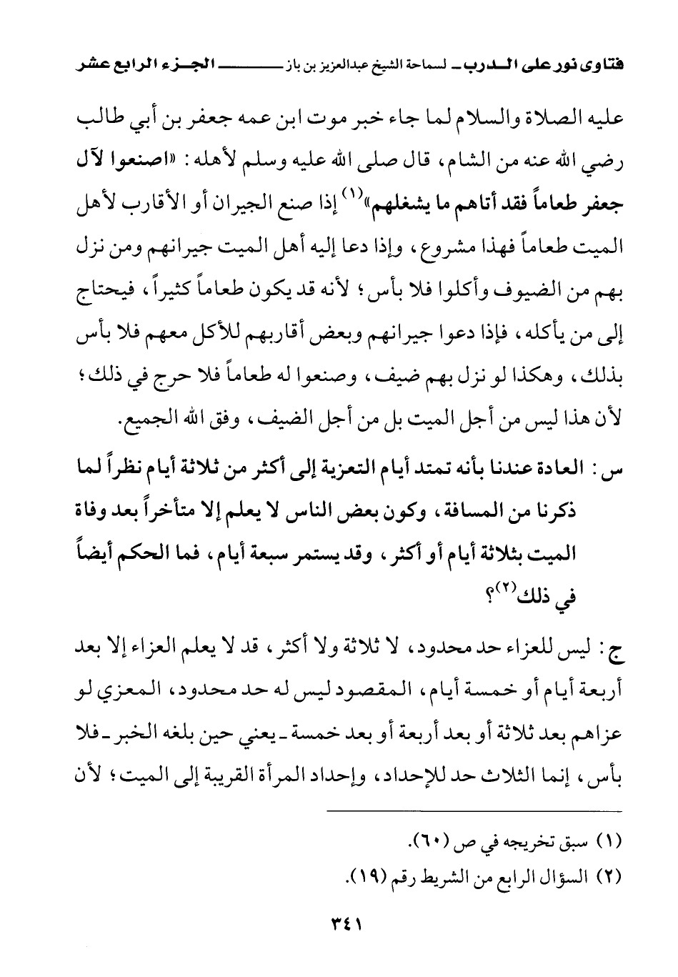 ج: ليس للعزاء حد محدود، لا ثلاثة ولا أكثر، قد لا يعلم العزاء إلا بعد أربعة أيام أو خمسة أيام، المقصود ليس له حد محدود، المعزي لو عزاهم بعد ثلاثة أو بعد أربعة أو بعد خمسة - يعني حين بلغه الخبر - فلا بأس، إنما الثلاث حد للإحداد، وإحداد المرأة القريبة إلى الميت؛ لأن