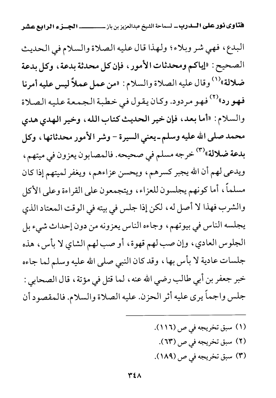 البدع، فهي شر وبلاء؛ ولهذا قال عليه الصلاة والسلام في الحديث الصحيح: «إياكم ومحدثات الأمور، فإن كل محدثة بدعة، وكل بدعة ضلالة (¬1)» وقال عليه الصلاة والسلام: «من عمل عملا ليس عليه أمرنا فهو رد (¬2)» فهو مردود. وكان يقول في خطبة الجمعة عليه الصلاة والسلام: «أما بعد، فإن خير الحديث كتاب الله، وخير الهدي هدي محمد صلى الله عليه وسلم - يعني السيرة - وشر الأمور محدثاتها، وكل بدعة ضلالة (¬3)» خرجه مسلم في صحيحه. فالمصابون يعزون في ميتهم، ويدعى لهم أن الله يجبر كسرهم، ويحسن عزاءهم، ويغفر لميتهم إذا كان مسلما، أما كونهم يجلسون للعزاء، ويتجمعون على القراءة وعلى الأكل والشرب فهذا لا أصل له، لكن إذا جلس في بيته في الوقت المعتاد الذي يجلسه الناس في بيوتهم، وجاءه الناس يعزونه من دون إحداث شيء، بل الجلوس العادي، وإن صب لهم الشاي لا بأس، هذه جلسات عادية لا بأس بها، وقد كان النبي صلى الله عليه وسلم لما جاءه خبر جعفر بن أبي طالب رضي الله عنه، لما قتل في مؤتة قال الصحابي: جلس واجما يرى عليه أثر الحزن. عليه الصلاة والسلام. فالمقصود أن