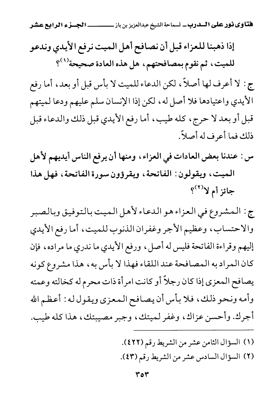 ج: المشروع في العزاء هو الدعاء لأهل الميت بالتوفيق وبالصبر والاحتساب، وعظيم الأجر وغفران الذنوب للميت، أما رفع الأيدي إليهم وقراءة الفاتحة فليس له أصل، ورفع الأيدي ما ندري ما مراده، فإن كان المراد به المصافحة عند اللقاء فهذا لا بأس به، هذا مشروع، كونه يصافح المعزى إذا كان رجلا أو كانت امرأة ذات محرم له كخالته وعمته وأمه ونحو ذلك، فلا بأس أن يصافح المعزى ويقول له: أعظم الله أجرك. وأحسن عزاك، وغفر لميتك وجبر مصيبتك، هذا كله طيب.