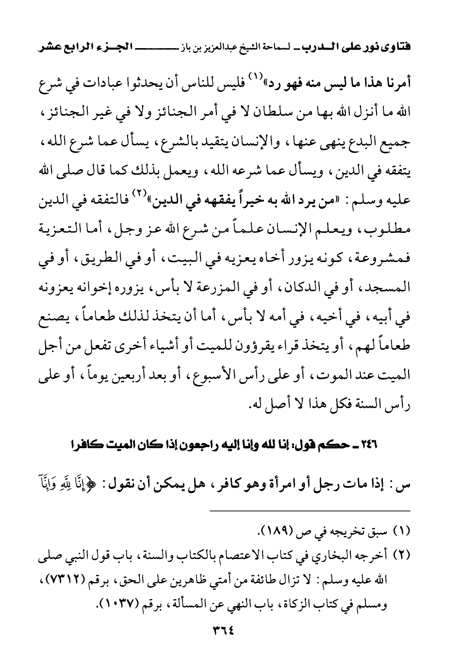 أمرنا هذا ما ليس منه فهو رد (¬1)» فليس للناس أن يحدثوا عبادات في شرع الله ما أنزل الله بها من سلطان لا في أمر الجنائز ولا في غير الجنائز، جميع البدع ينهى عنها، والإنسان يتقيد بالشرع، يسأل عما شرع الله، يتفقه في الدين، ويسأل عما شرعه الله، ويعمل بذلك كما قال صلى الله عليه وسلم: «من يرد الله به خيرا يفقهه في الدين (¬2)» فالتفقه في الدين مطلوب، ويعلم الإنسان علما من شرع الله عز وجل، أما التعزية فمشروعة، كونه يزور أخاه يعزيه في البيت، أو في الطريق أو في المسجد أو في الدكان أو في المزرعة لا بأس، يزوره إخوانه يعزونه في أبيه، في أخيه، في أمه لا بأس، أما أن يتخذ لذلك طعاما، يصنعن طعاما لهم، أو يتخذ قراء يقرؤون للميت أو أشياء أخرى تفعل من أجل الميت عند الموت، أو على رأس الأسبوع، أو بعد الأربعين يوما، أو على رأس السنة فكل هذا لا أصل له.