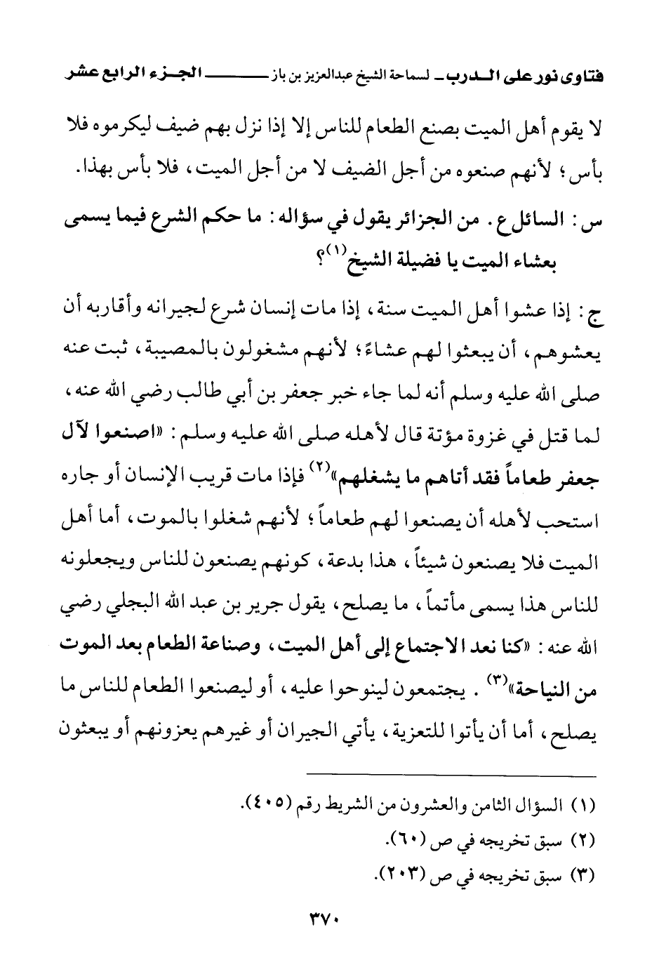 ج: إذا عشوا أهل الميت سنة، إذا مات إنسان شرع لجيرانه وأقاربه أن يعشوهم، أن يبعثوا لهم عشاء؛ لأنهم مشغولون بالمصيبة، ثبت عنه صلى الله عليه وسلم أنه لما جاء خبر جعفر بن أبي طالب رضي الله عنه، لما قتل في غزوة مؤتة قال لأهله صلى الله عليه وسلم: «اصنعوا لآل جعفر طعاما؛ فقد أتاهم ما يشغلهم (¬2)» فإذا مات قريب الإنسان أو جاره استحب لأهله أن يصنعوا لهم طعاما؛ لأنهم شغلوا بالموت، أما أهل الميت فلا يصنعون شيئا، هذا بدعة، كونهم يصنعون للناس ويجعلونه للناس هذا يسمى مأتما، ما يصلح، يقول جرير بن عبد الله البجلي رضي الله عنه: «كنا نعد الاجتماع إلى أهل الميت، وصناعة الطعام بعد الموت من النياحة (¬3)» يجتمعون لينوحوا عليه، أو ليصنعوا الطعام للناس ما يصلح، أما أن يأتوا للتعزية، يأتي الجيران أو غيرهم يعزونهم أو يبعثون
