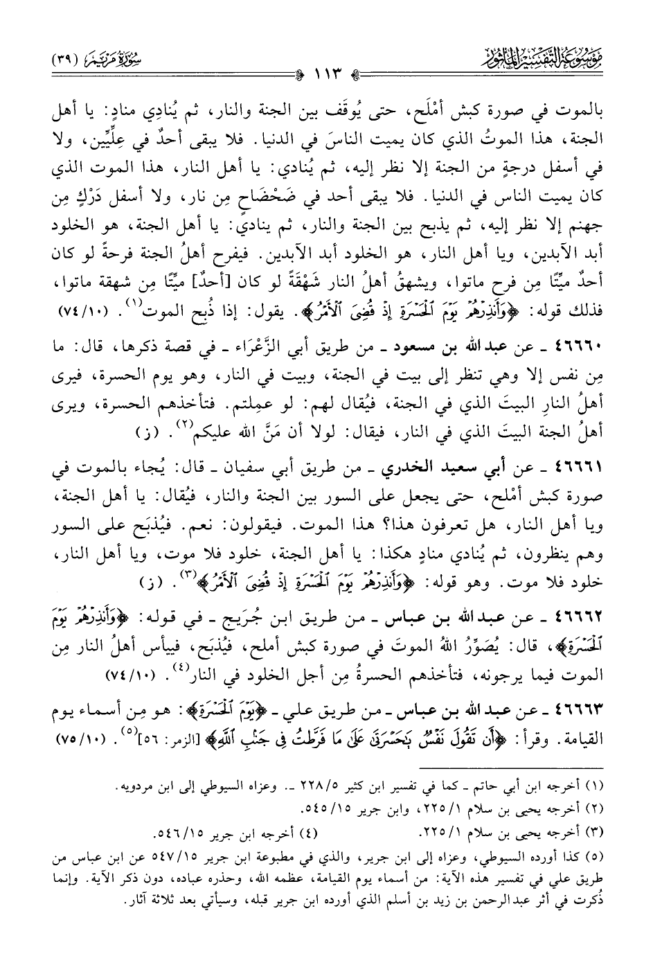 ٤٦٦٦٣ - عن عبد الله بن عباس -من طريق علي- {يوم الحسرة}: هو مِن أسماء يوم القيامة. وقرأ: {أن تقول نفس يا حسرتا على ما فرطت في جنب الله} [الزمر: ٥٦] (¬٥). (١٠/ ٧٥)